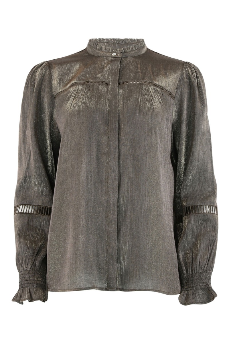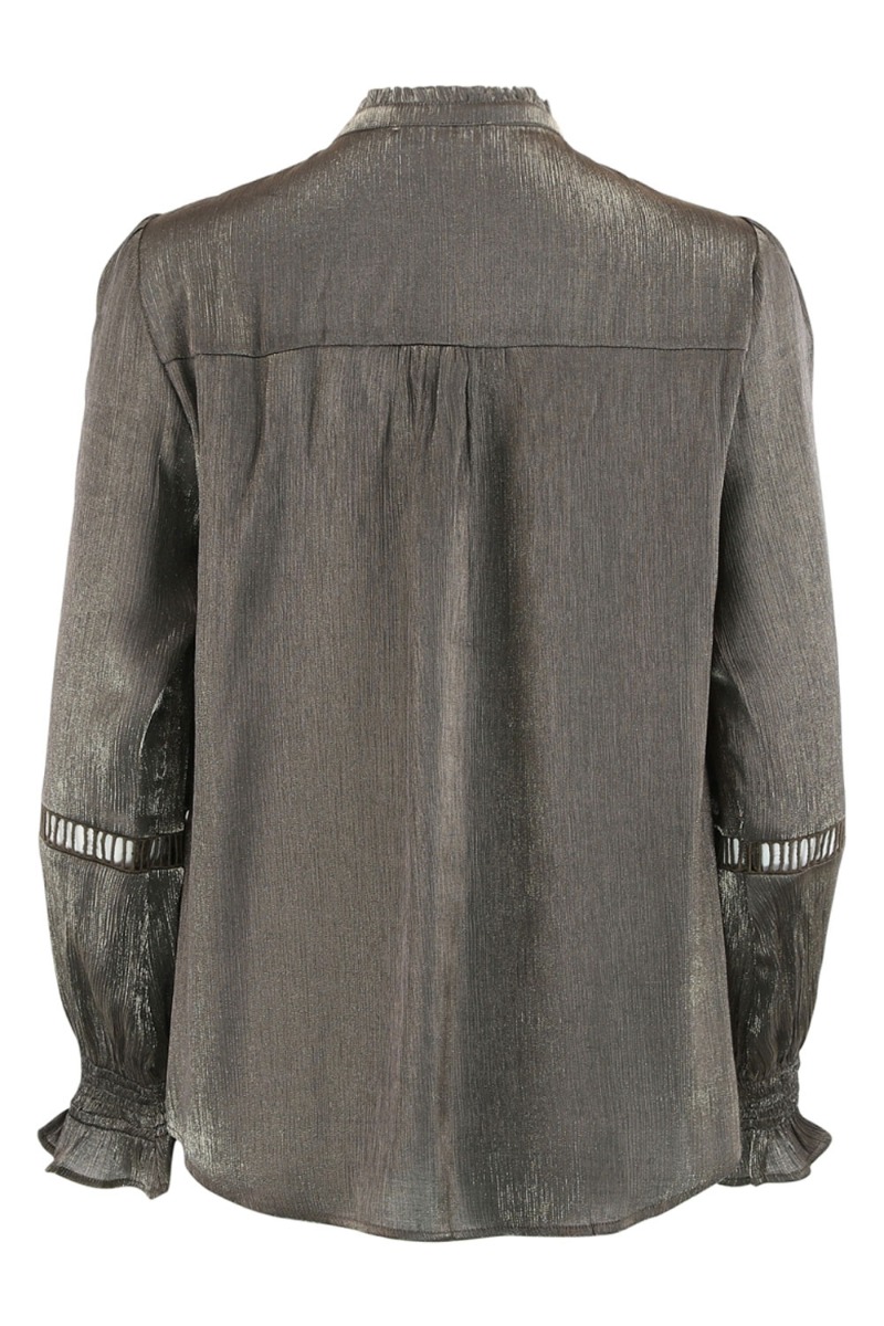 En fin skjorte fra Continue er kommet til denne sæson. Den er med skjult knapluknign foran og afsluttes med en lille flæsekant ved halsen. Der er fine blondedetaljer på begge ærmer og her afsluttes ærmet også med en smock effekt og en flæsekant. Der findes et par matchende bukser så du kan bruge det som et sæt.
