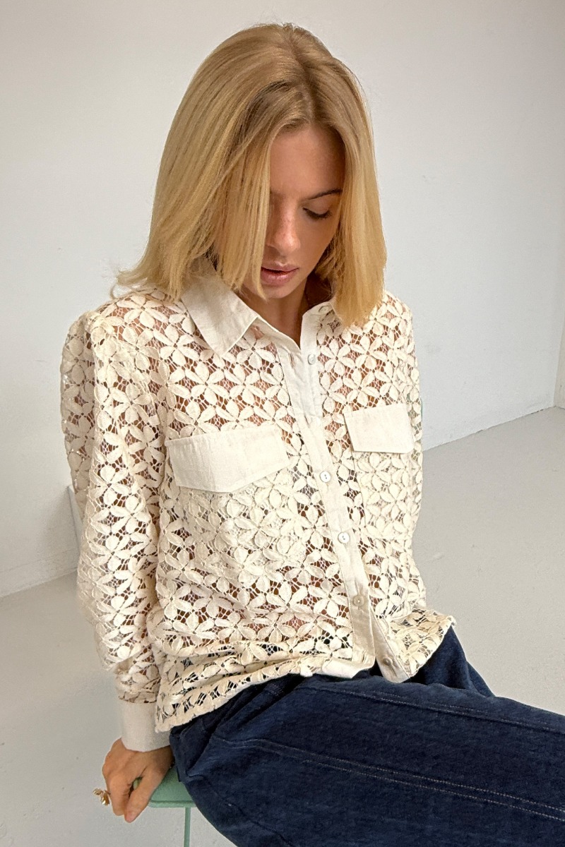 Blusen er lavet i en let, offwhite blonde med et gennemgående blomsterinspireret mønster, som giver et feminint og luftigt udtryk. Den har en klassisk skjortekrave og knaplukning foran, der tilfører et tidløst og elegant præg. Brystlommerne i fast stof skaber en smuk kontrast til den transparente blonde og giver blusen karakter. De lange ærmer afsluttes med manchetter, som giver et mere struktureret og velklædt look. Samlet set er blusen en elegant kombination af romantisk blonde og klassiske skjortedetaljer.