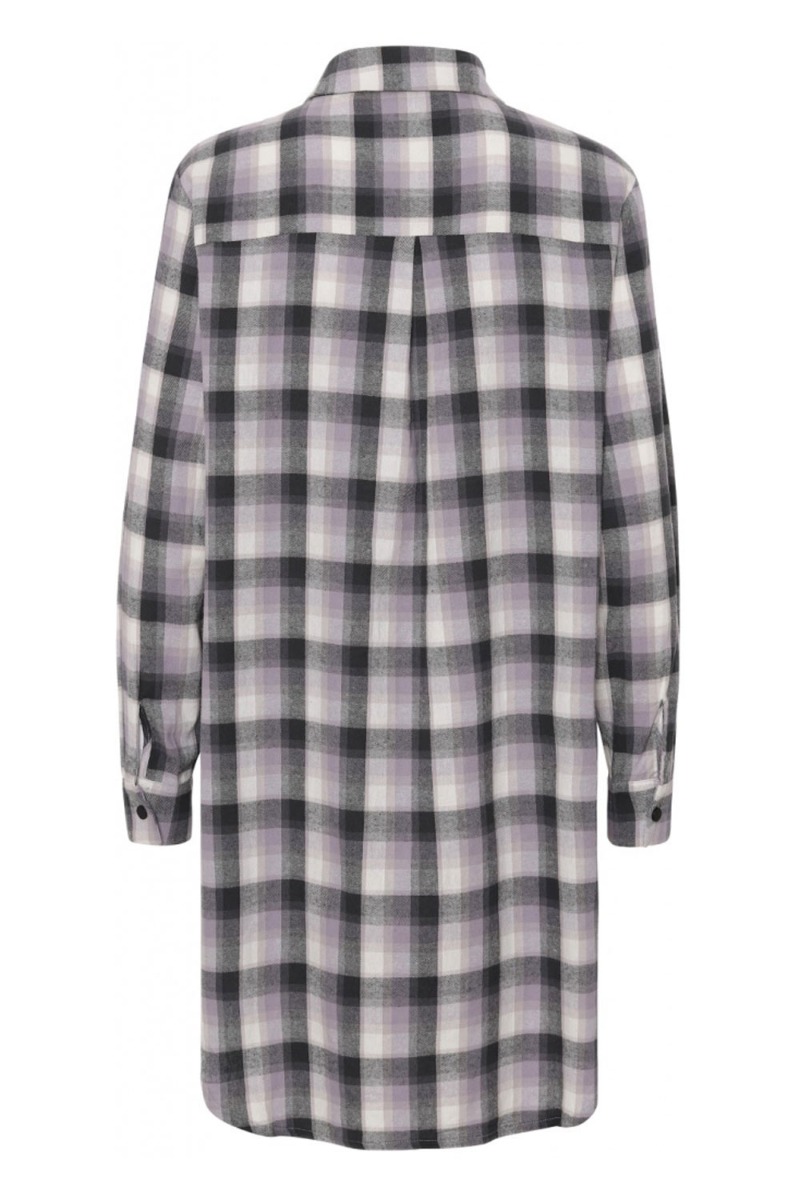Lang skjorte fra Continue i ternet lilla print. Skjorten har en lille runding i bunden der giver et lille slids i hver side. Foran lukkes den med trykknapper, der gør den anvendelig både at bruge åbent og lukket.