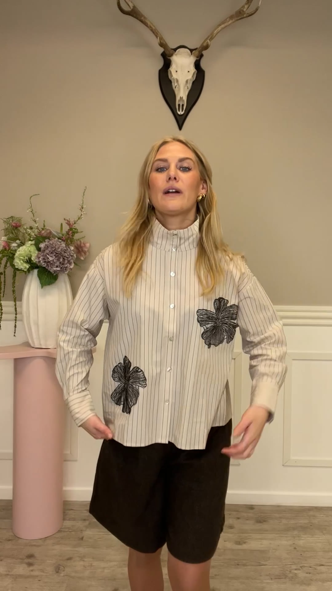 En fin skjorte i en løs pasform er kommet til denne sæson med striber i sort og med et fint broderi. Den er med høj hals og knappes foran som gør at den også er ammevenlig. Den er fin til hverdag med et par bukser.