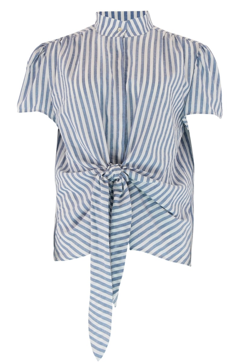 Fineste Continue bluse i et simpelt design med blå/hvid stribet mønster og knapper foran. Skjorten er med korte ærmer og bindebåndsdetalje foran. Style den med de matchende shorts eller jeans alt efter anledning.