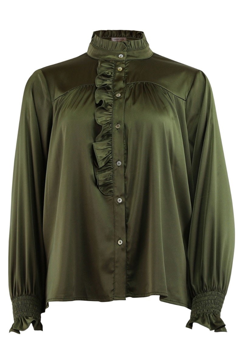 Continue bluse i en flot army farve med shineeffekt. Skjorten har et feminint snit med knapper hele vejen ned og er designet med flæsedetaljer langs kanten og ved håndleddet.
