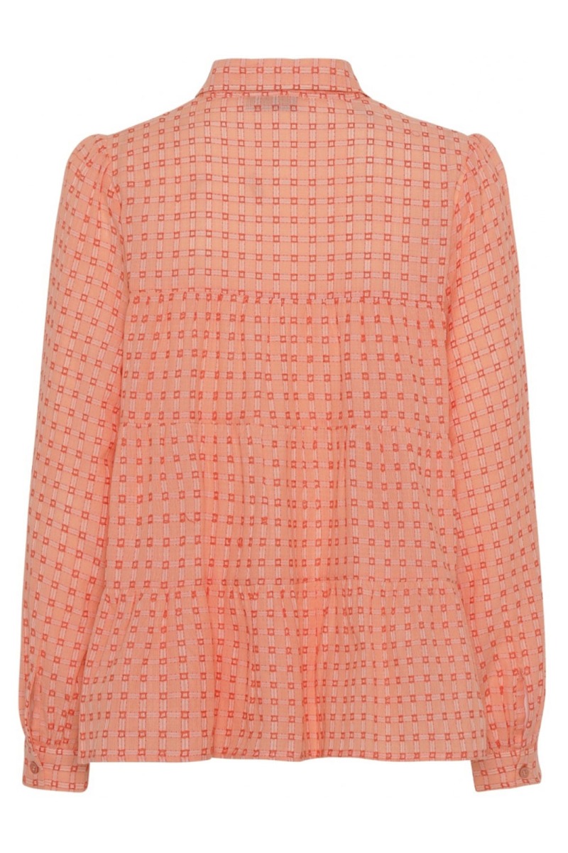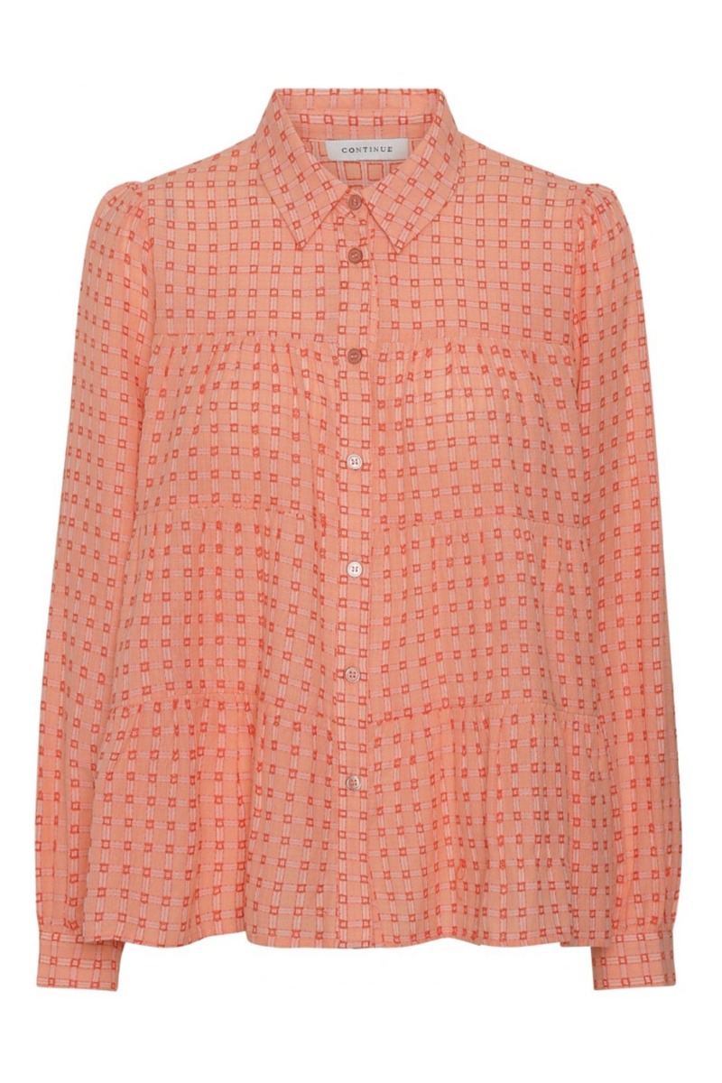Vi elsker disse modeller fra Continue med det fineste peplum der giver et lille løst ballon-snit. Skjorten lukkes foran med orange knapper og har et grafisk ternet print. Den er lavet i et blødt materiale med lange ærmer der afsluttes med et fast stykke med knapper. Style den til hverdag eller med et par "pæne" bukser.