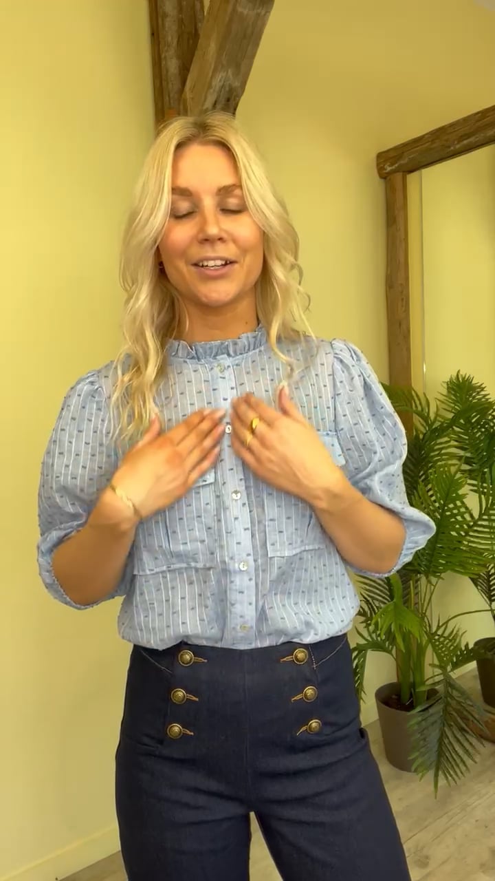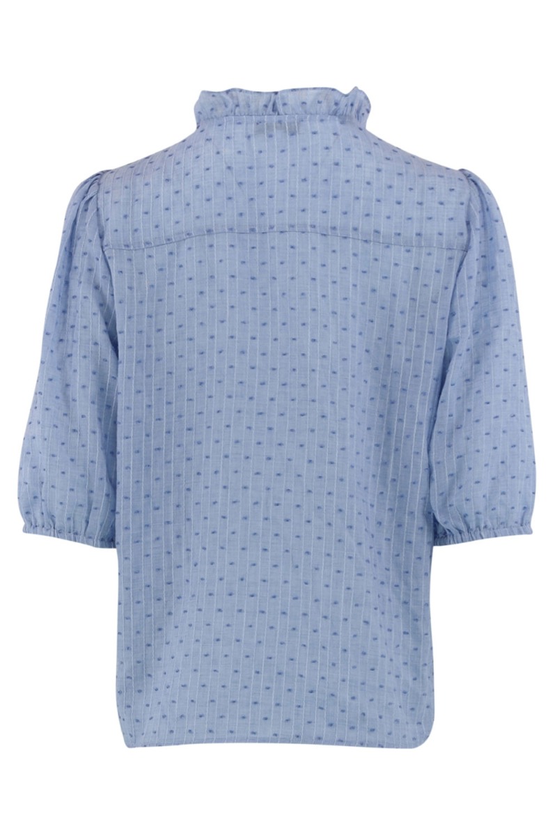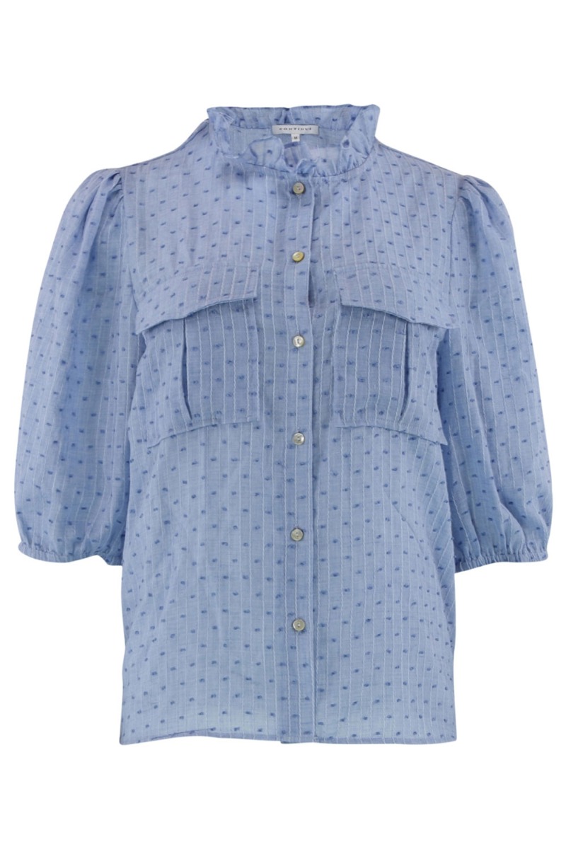 En sød skjorte fra Continue i hvid med søde prik detaljer i stoffet som giver en smule 3D effekt. Det er en klassisk skjore model med lommer på brystet og synlig knaplukning. Derudover er den med kinakrave som er markeret med en flæsekant. Den findes også i flere farver.
