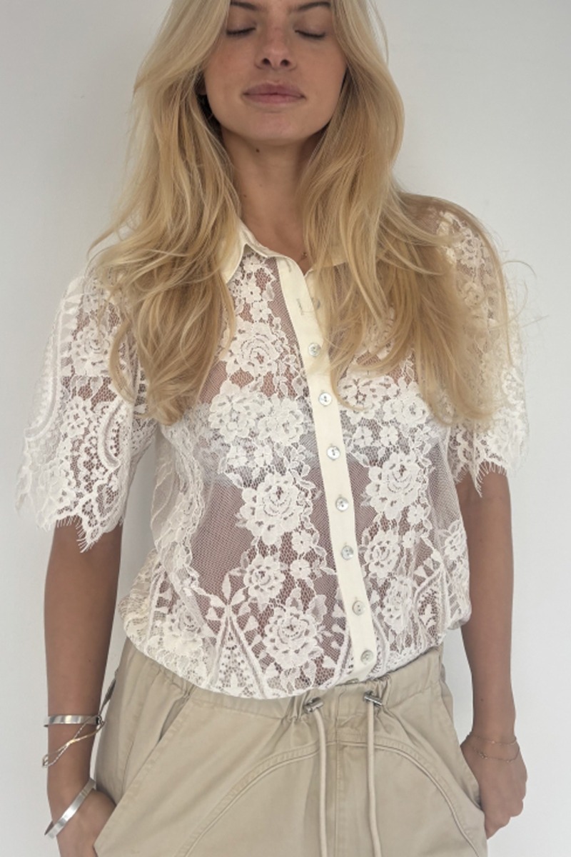 Feminin blondebluse i en let transparent kvalitet med klassisk krave og korte ærmer, der giver et elegant og romantisk udtryk. De fine blondedetaljer og den lette struktur gør den ideel både til hverdag og fest, hvor den kan styles lag-på-lag eller med en enkel top under. En tidløs style, der tilfører garderoben et sofistikeret og moderne look.