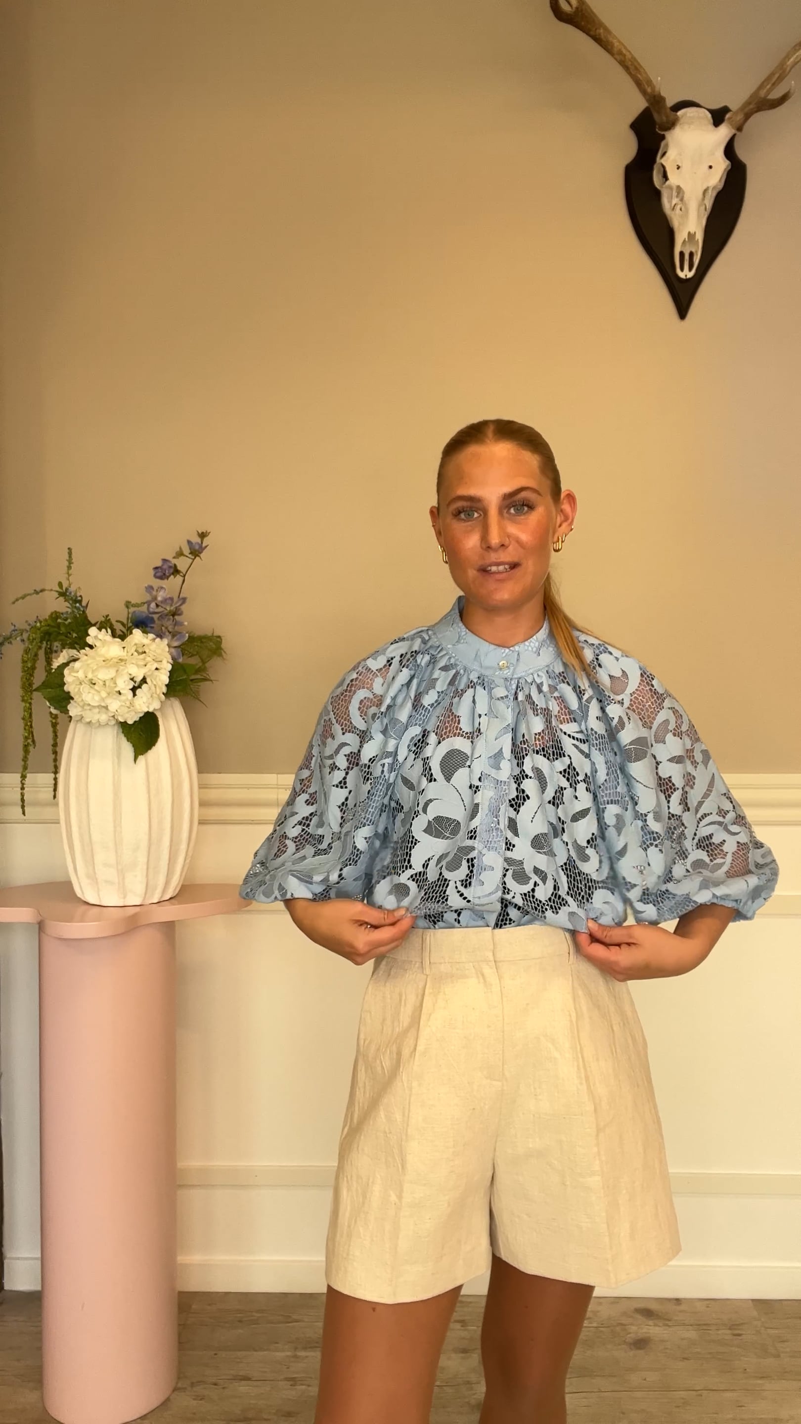 En smuk skjorte fra Continue i blå er landet. Denne skjorte har 3/4 lange ærmer samt skjult knaplukning foran. Derudover er den lavet med blonde hele vejen igennem derfor er den også gennemsigtig og vi anbefaler at du bruger en top under.