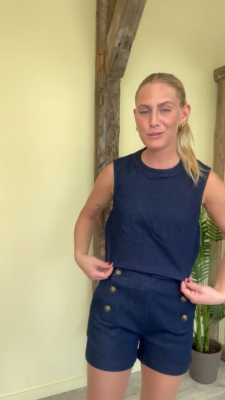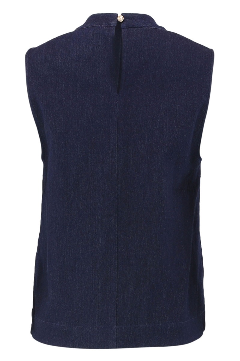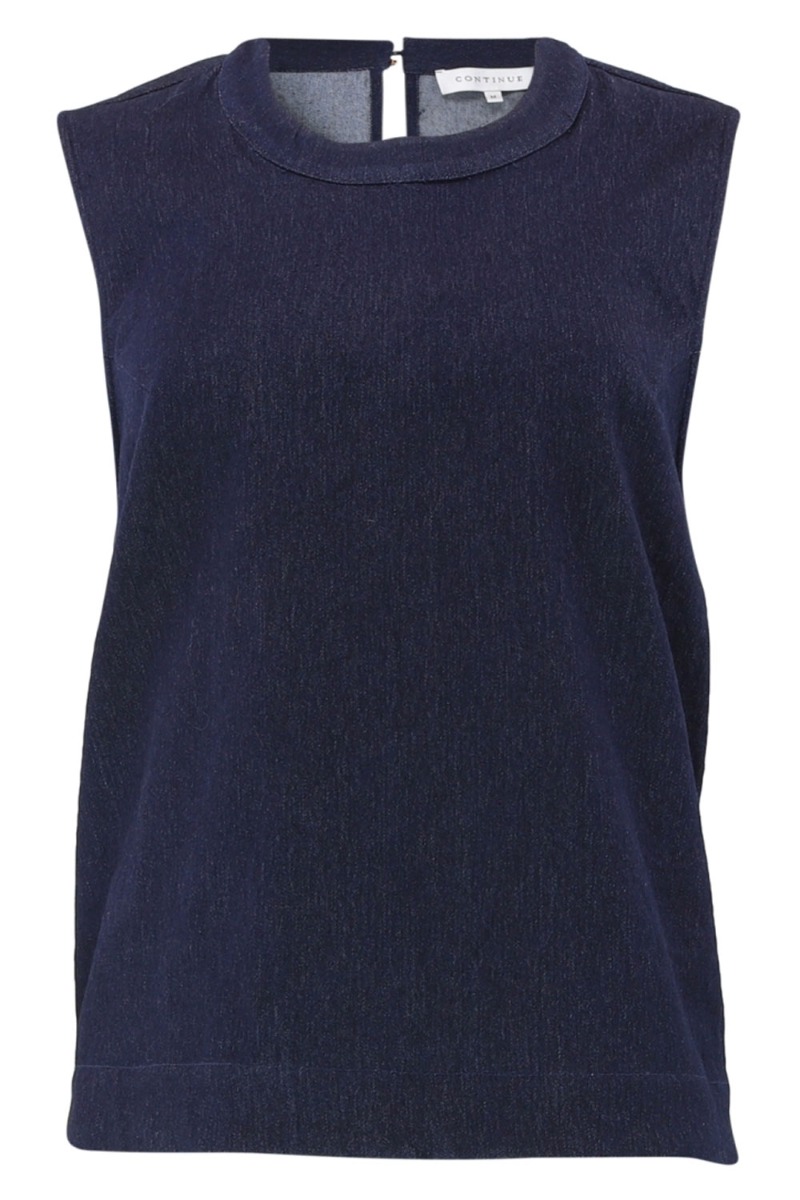 En skøn top i denim look fra Continue. Kvaliteten er dejlig blød og er med stræk. Den lukkes bagpå i nakken med en lille knap og kan nemt bruges til et par shorts eller en buks du har hjemme i skabet. Det er en top der nem at style hele året og derfor god til din garderobe.