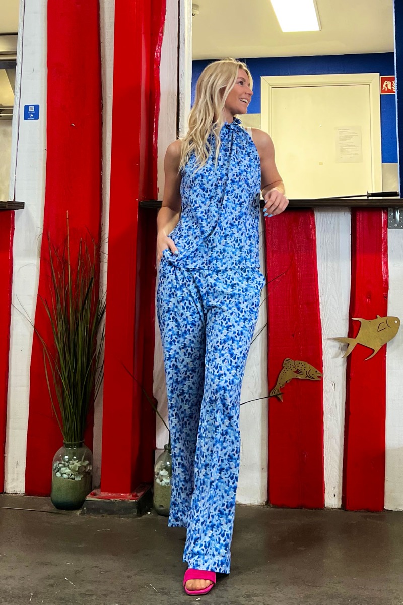 Smuk blomstret bluse fra Continue i flotte blå nuancer. Toppen har rynkedetalje ved kraven der bindes bagtil og giver en sød lille åbning. Den er i en let løs pasform og super smuk at style som sæt med de matchende bukser i samme print.