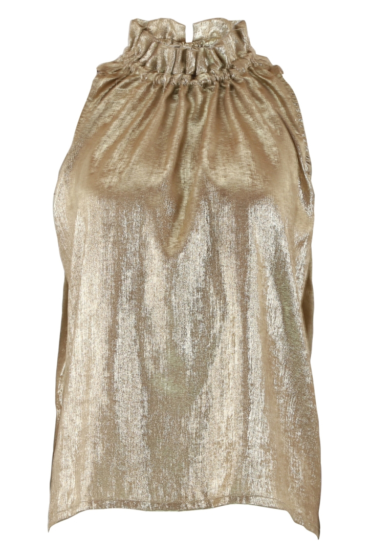 Fin og festlig top fra Continue. Denne top er uden ærmer og bindes i nakken. Toppen har en flot guldfarvet nuance og en løs pasform. En elegant top at bruge til de kommende julefrokoster, nytår eller andre særlige anledninger.