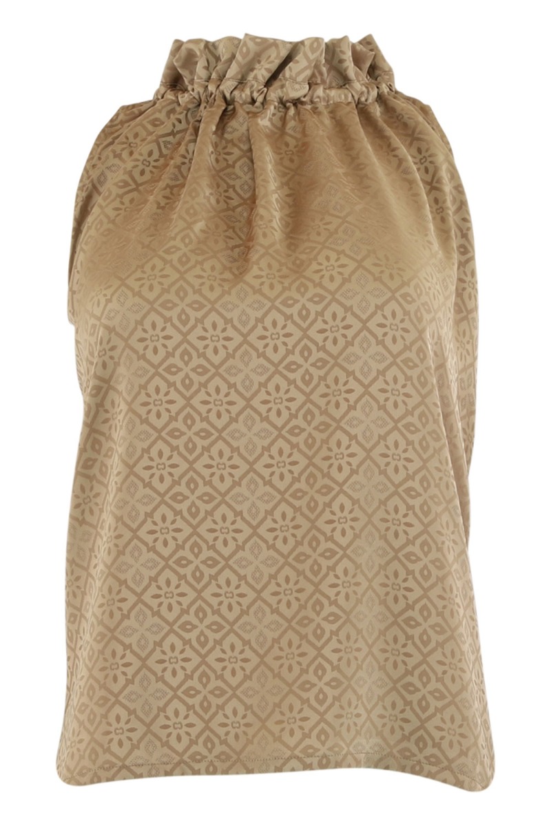 Et sej top fra Continue er kommet i beige med mønster i stoffet. En helt let kvalitet og løs pasform. Toppen er uden ærmer og har en fin flæsekant ved halsen. Derudover lukkes halsen i nakken med en simpel sløjfeeffekt. Derfor kan den også snørres ind og ud alt efter hvor stram den skal være. Top findes også i sort og der er matchende bukser til.
