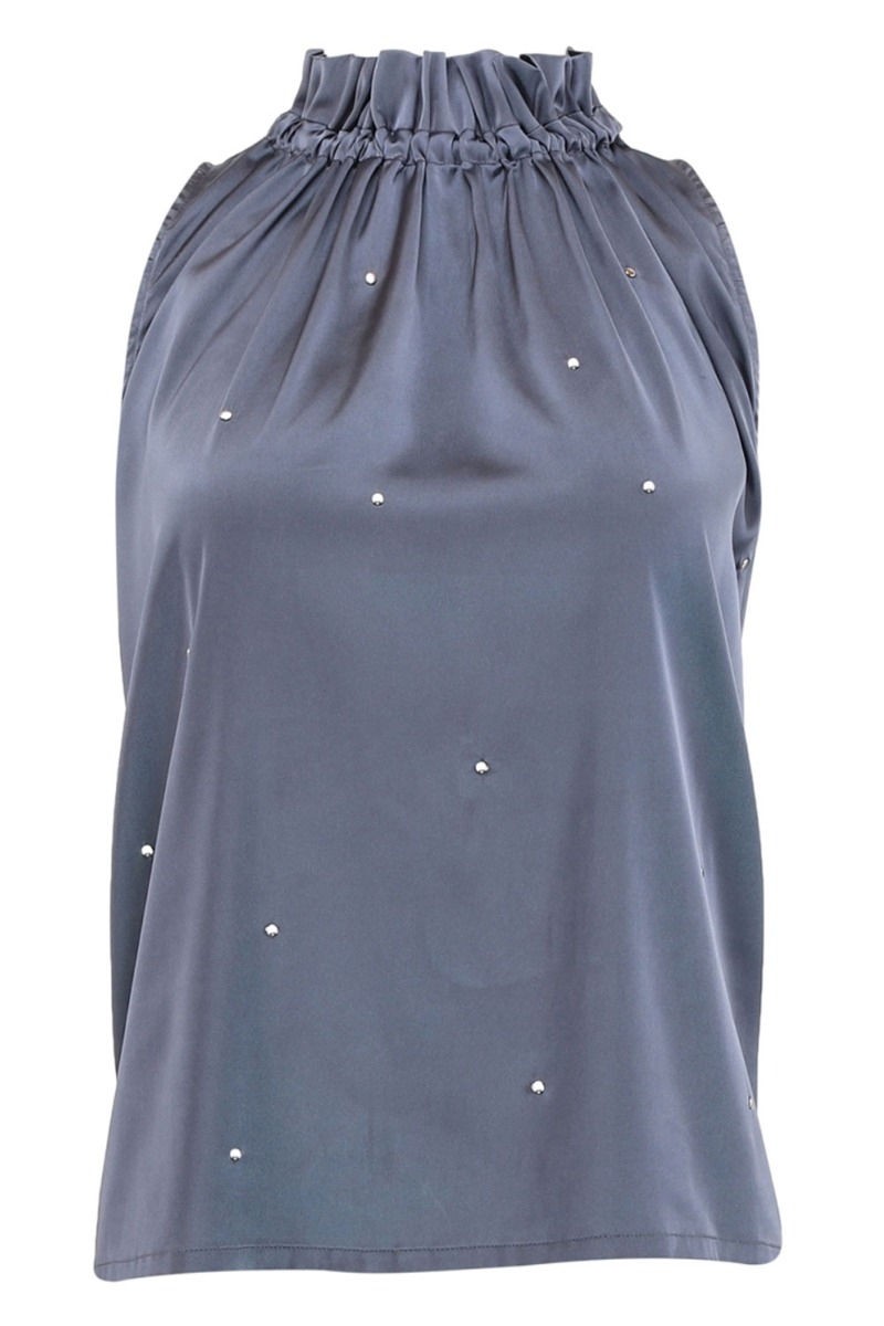 En fin top i grå med nitter fastklemt i stoffet. Den er fra Continue og har den klassisk Liva pasform med den fine rynkedetalje og sløjfedetaljer ved halsen. Den er i et satinlook og fin til et par habitbukser eller måske et par bukser i samme satinlook. Den findes i flere farver.