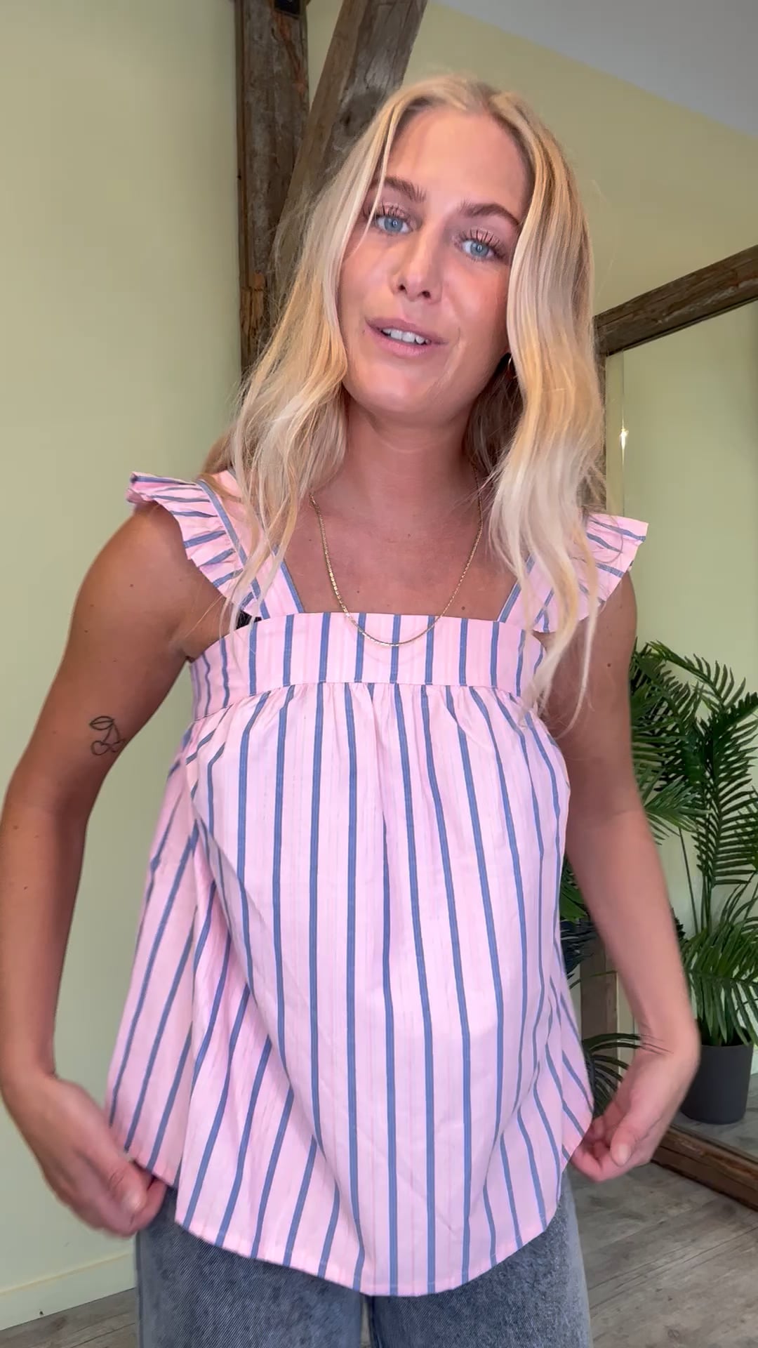 Sødeste fine top fra Continue i stribet mønster i lyserød og blå. Toppen er i et løst snit med de fineste flæsedetaljer på stropperne og firkantet udskæring. Bagtil er blusen åben med en flot sløjfedetalje der er oplagt både til en varm sommerdag og festerne.