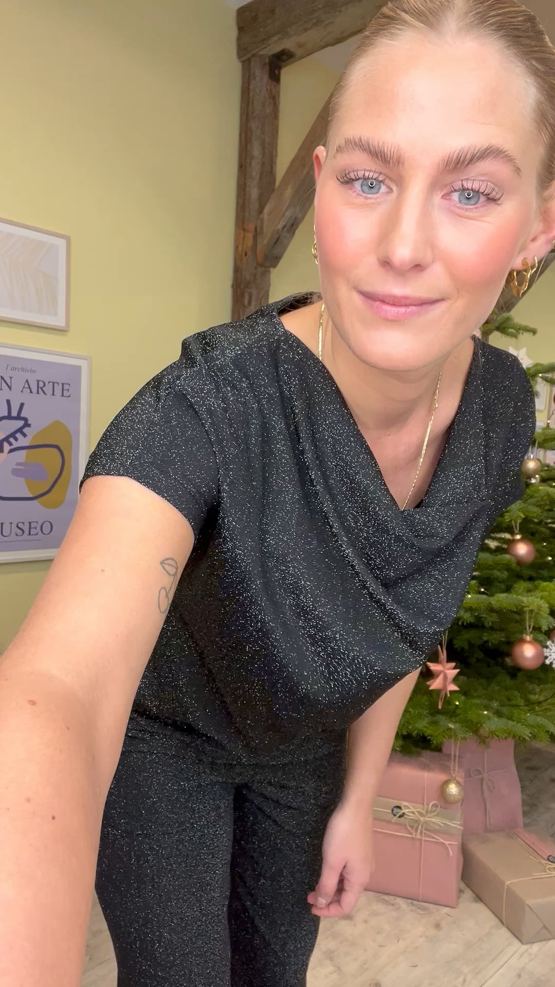 En skøn top fra Continue er kommet i sort med glimmereffekt. Den er med korte ærmer og er løs i pasformen. Derudover er der lavet et lille vandfald ved halsen som giver et feminint udtryk. Den passer fint sammen med de matchende bukser fra samme mærke - men kan sagtens bruges til hvilken som helst underdel.