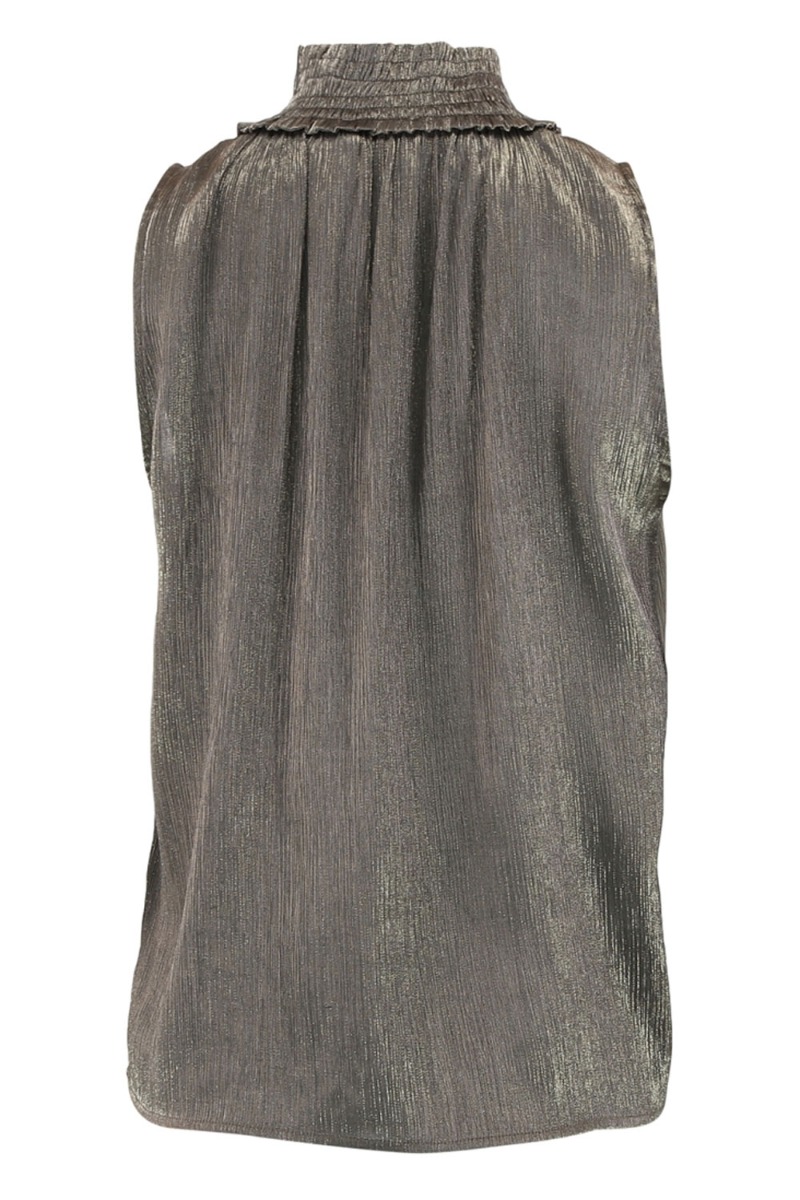 En fin top fra Continue er kommer i en smuk brun guld farve. Kvaliteten er plisseret og pasformen er løs. Den har ingen ærmer og har smockeffekt ved halsen som ender i en lille flæsekant på begge sider af smockkanten. Den er perfekt sammen med de matchende bukser fra samme mærke. Men kan bruges til hvilken som helst bukser.
