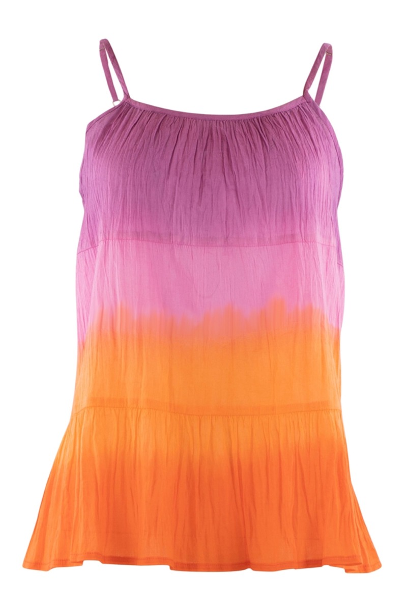 Den sejeste top fra Continue. Toppen er rosa øverst og orange i bunden med flydende overgang der giver et cool "tie dye" print. Stropperne kan reguleres og pasformen er løs samt med et lille peplum skørt i bunden. Den stråler da bare af sommer og passer til enhver anledning.