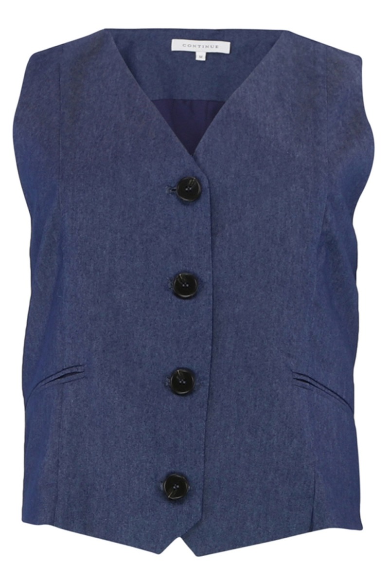 En fin vest fra Continue i en tynd denim kvalitet med knapper i sort foran. Den er klassisk i modellen og har snydelommer foran, derudover er den fin til både nederdel og bukser. Pasformen er løs og derfor fin med en t-shirt under. Den findes i flere farver og kvaliteter også fra Continue.