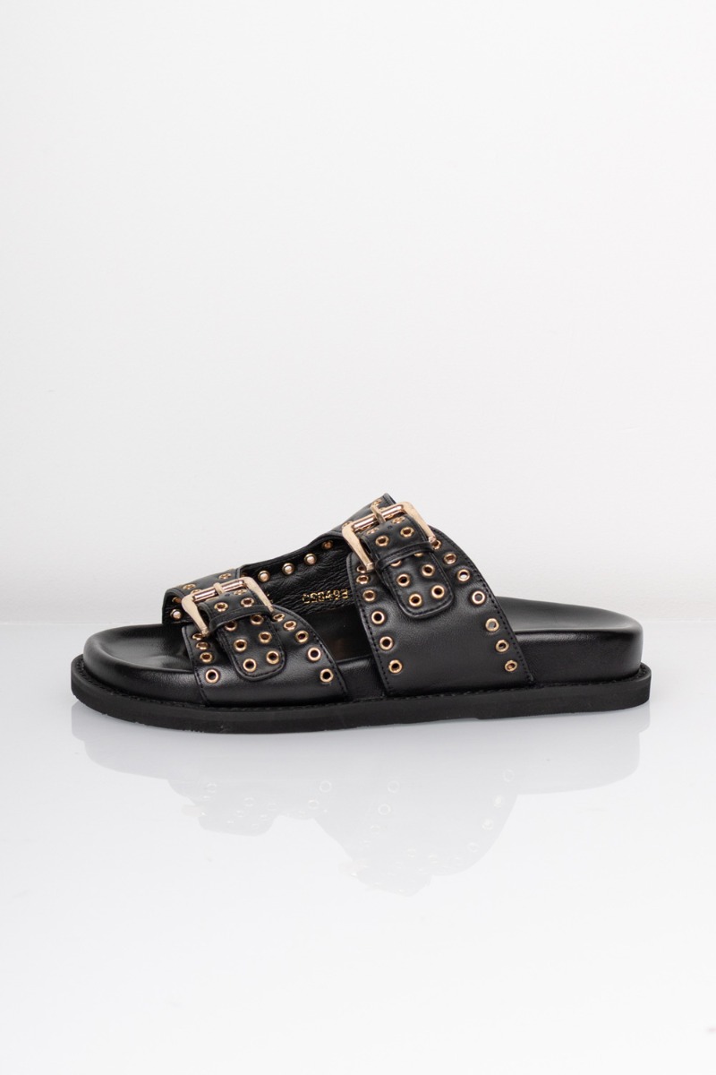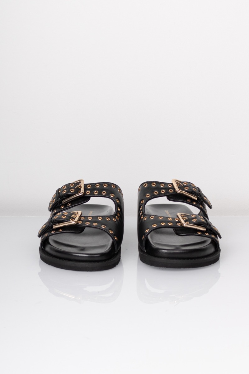 Sandaler fra Copenhagen Shoes med rå nitte detaljer. Disse sandaler har en sort farve i det lækreste læder. De passer til alt og er super behagelige, hele dagen! Super bløde i bunden. Dog er du mellem to str skal du tage den største. Sandalerne er nemlig lille i str.