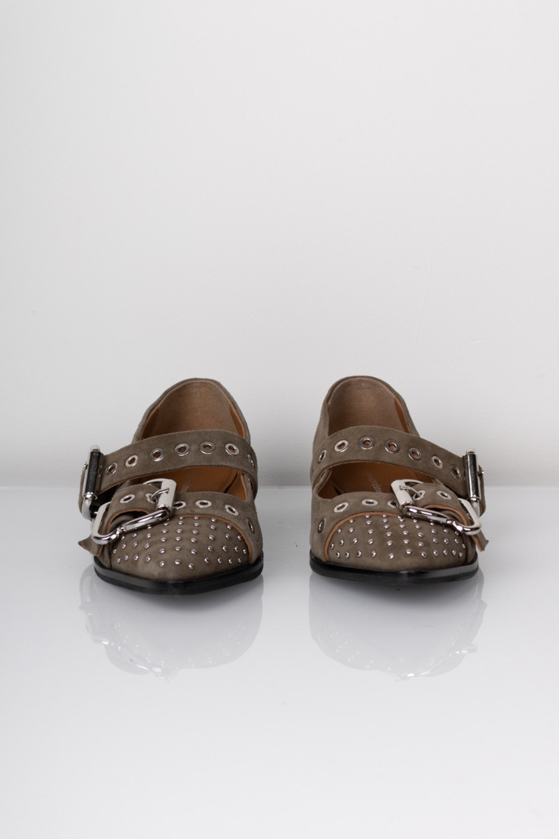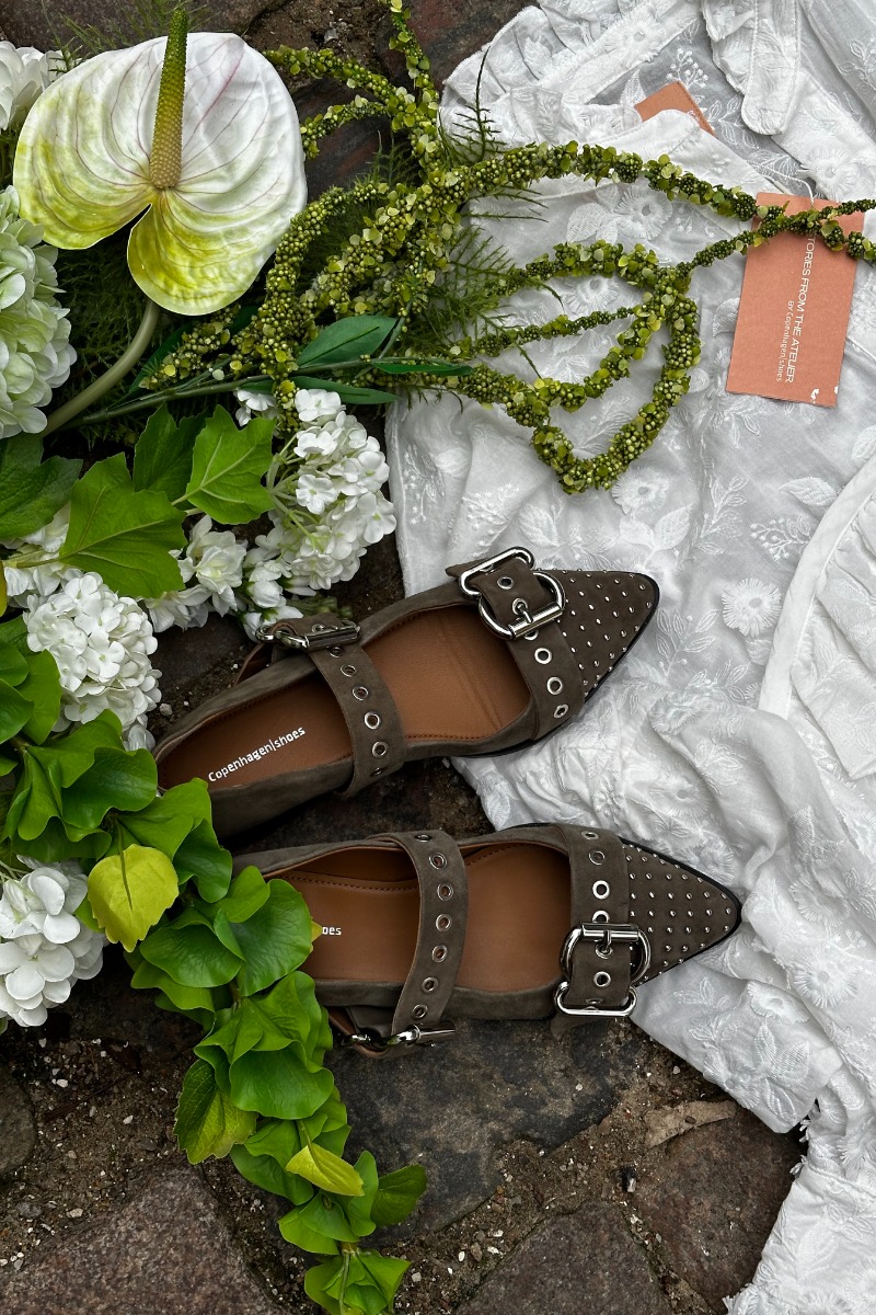En fin ballerina fra Copenhagen Shoes er kommet i grøn med seje detaljer. Den er en to spænde som sidder henover vristen og der er smukke nitte detaljer ved snuden. Den er perfekt til et simpelt outfit og kan nemt bruges både til fest og hverdag. Den findes i flere farver.