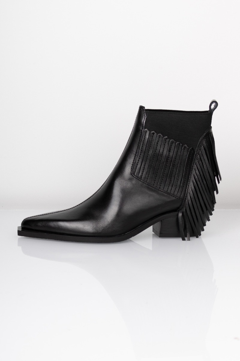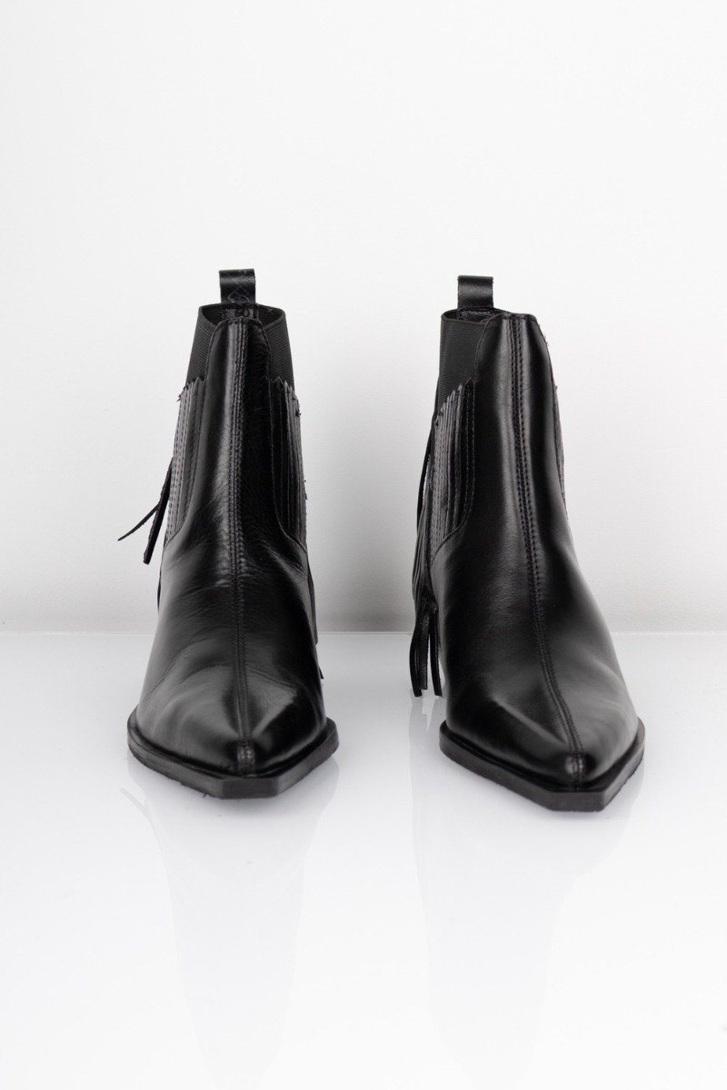 Støvler fra Copenhagen Shoes. Disse støvler har et sejt cowboy-agtig look! De er designet i læder med en spids skospids og de fineste frynser.