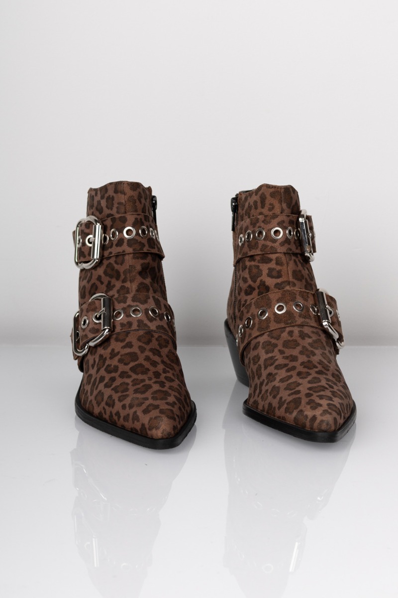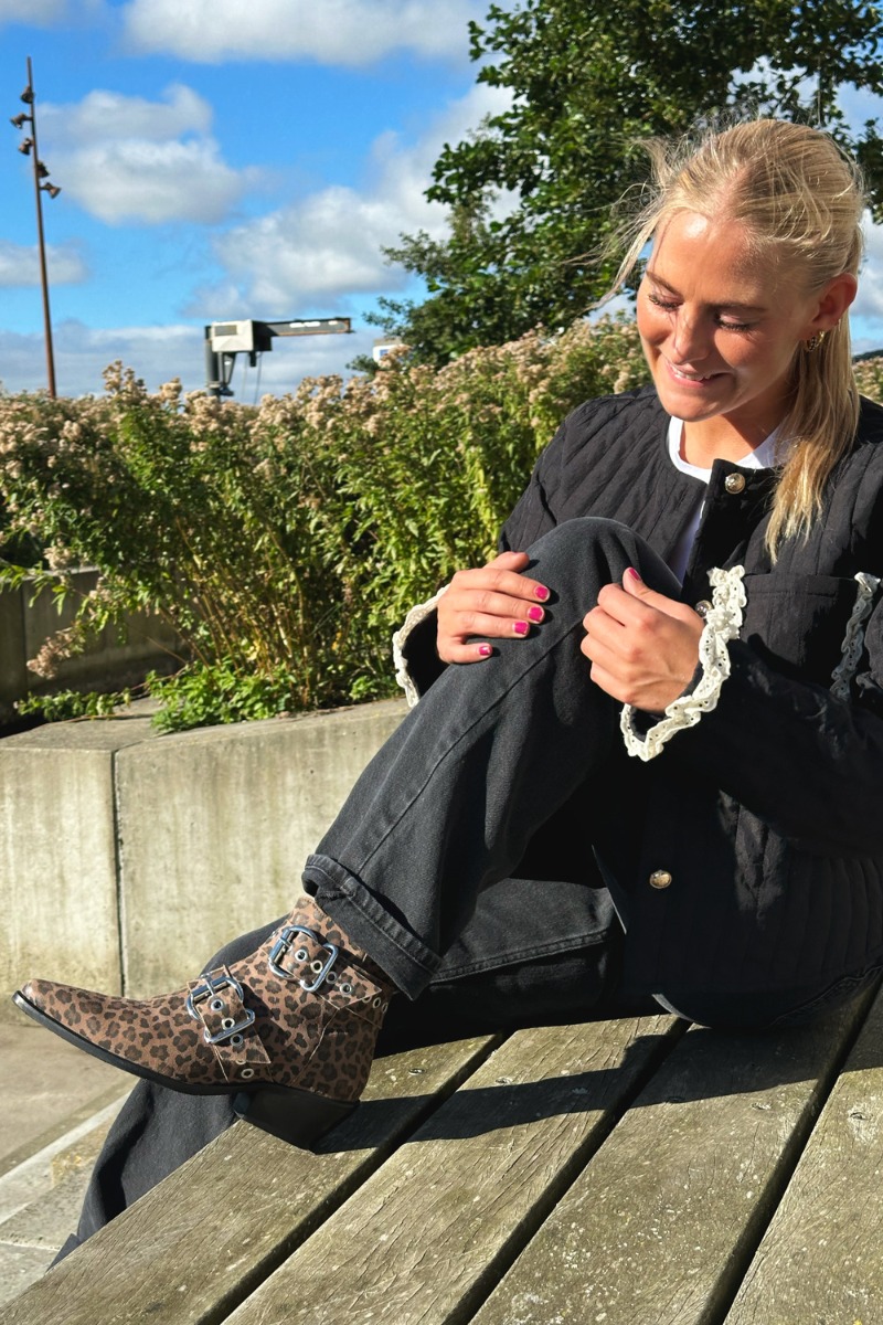 En smuk støvle med en anelse hæl og med den populærer spidse snude fra Copenhagen Shoes. Den er selvfølgelig lavet i dette leopard print og har en cool spænde på siden. Den kan nemt styles til hverdag med en neutral buks eller til fest med en kjole.