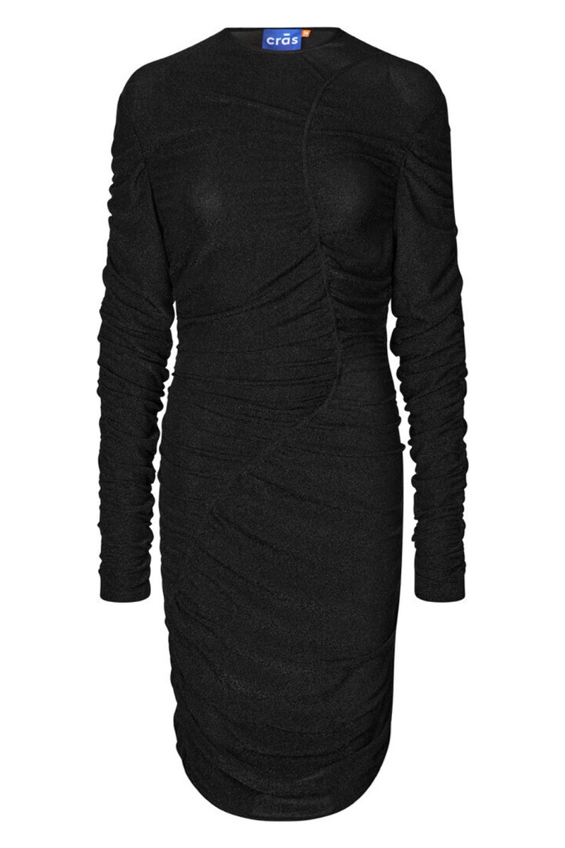 Den fineste kjole fra Crás er kommet i sort med glimmereffekt. Denne kjole er tætsiddende, men der er rynkedetaljer i siden og foran foran så den ikke strammer. Der sidder en syning foran som snoer sig fra skulder til modsatte hofte som giver et feminint udtryk. Fin til fest med stiletter.