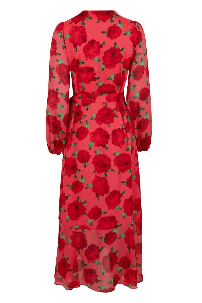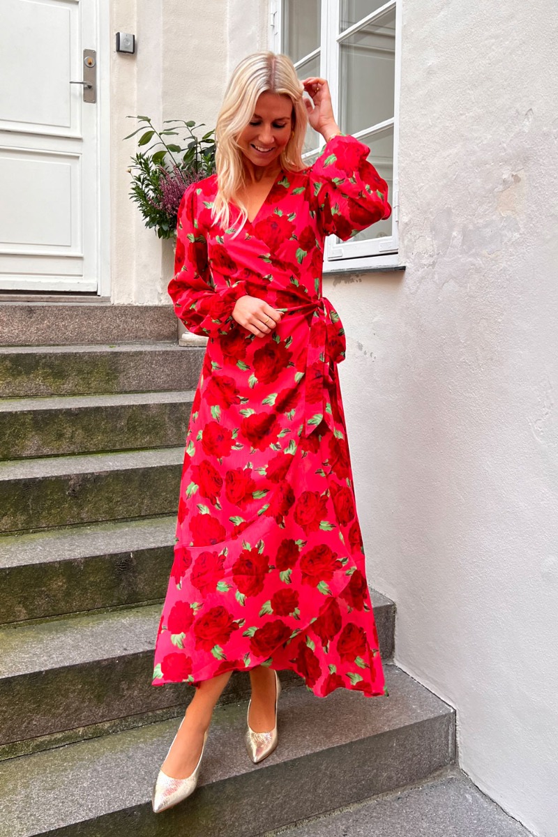 Hvis ikke du allerede har opdaget det så er farven rød en af årets største TRENDS! Kjolen er med røde roser som vi heller ikke går ned på denne sæson og man kan ikke andet end at føle sig som en drøm i denne sag. Kjolen er med slå-om der bindes i siden. Den falder så smukt og er oplagt til sommerens fester.