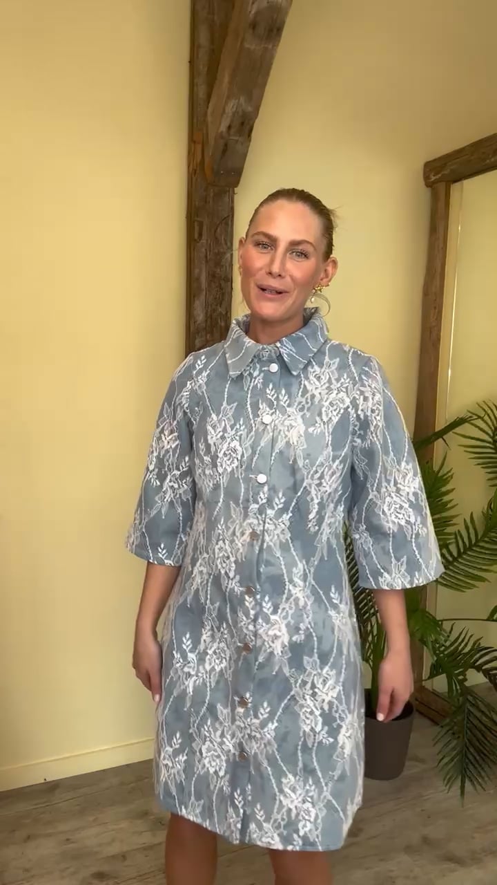 En kjole man bare skal eje fra Crás til forårets fester. Kjolen har et fint feminin snit og knaplukning hele vejen ned foran. Kjolen er i en lys denim med hvid blondestof omkring der gør den unik og smuk på samme tid. Style den både med en rå støvle til koncerterne eller brug den med en stilet til festerne.