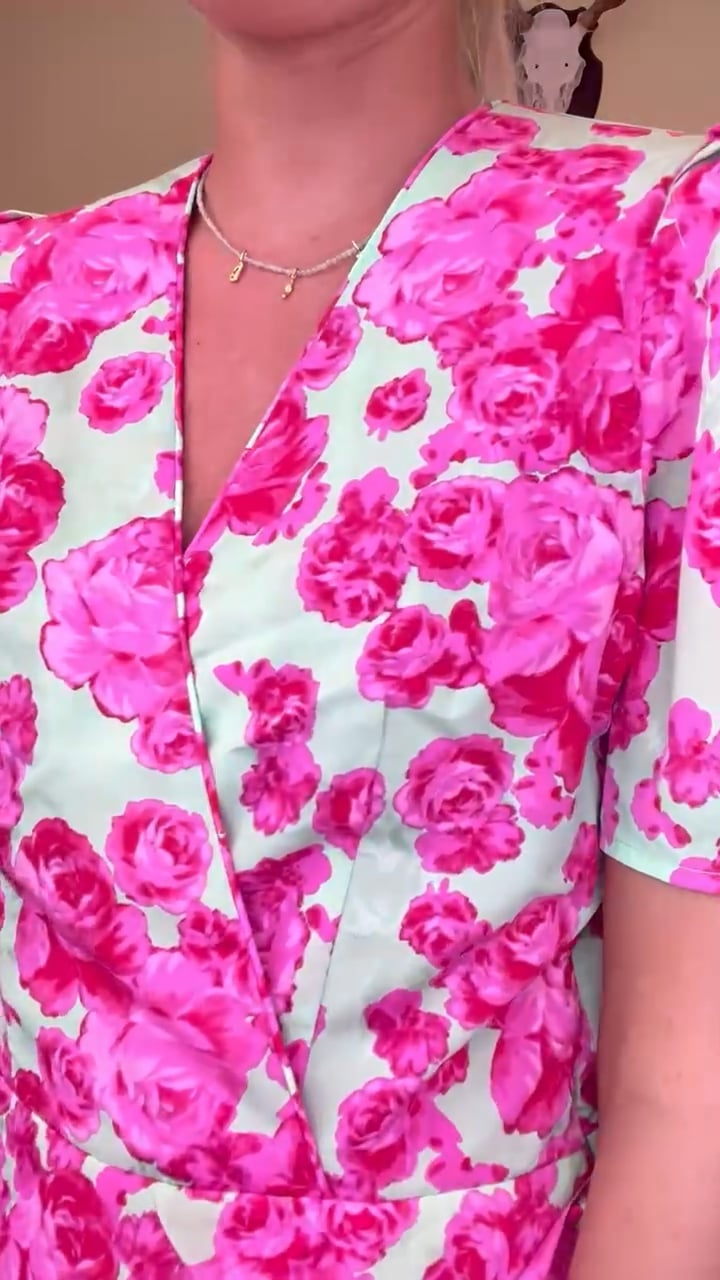 Kjolen har den skønneste pasform med snyde lukning i siden der skaber en slå-om-effekt. Den har skjult lynlås i siden så den er nem at komme i og har. Men se lige det flotteste print. Bundfarven er grøn med et pink blomsterprint - waauw! Pasformen klæder utrolig mange kropstyper og er perfekt til de mange fester med en stilet.