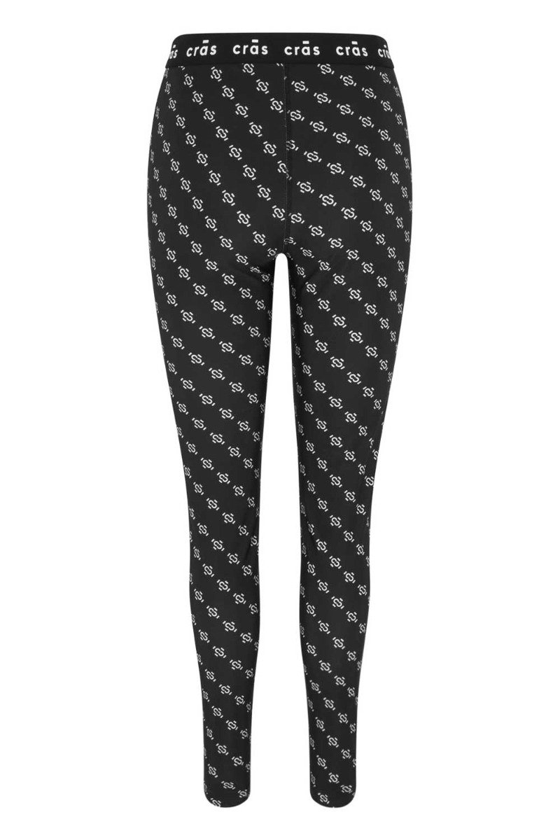 Sorte leggings fra Crás med et hvidt logo på. Disse leggings er tætsiddende med en smule shineeffekt og stretch. De er så behagelige at have p med en bred elastikkant i livet der er detaljeret med teksten Crás. Style med matchende bluse under en blazer.