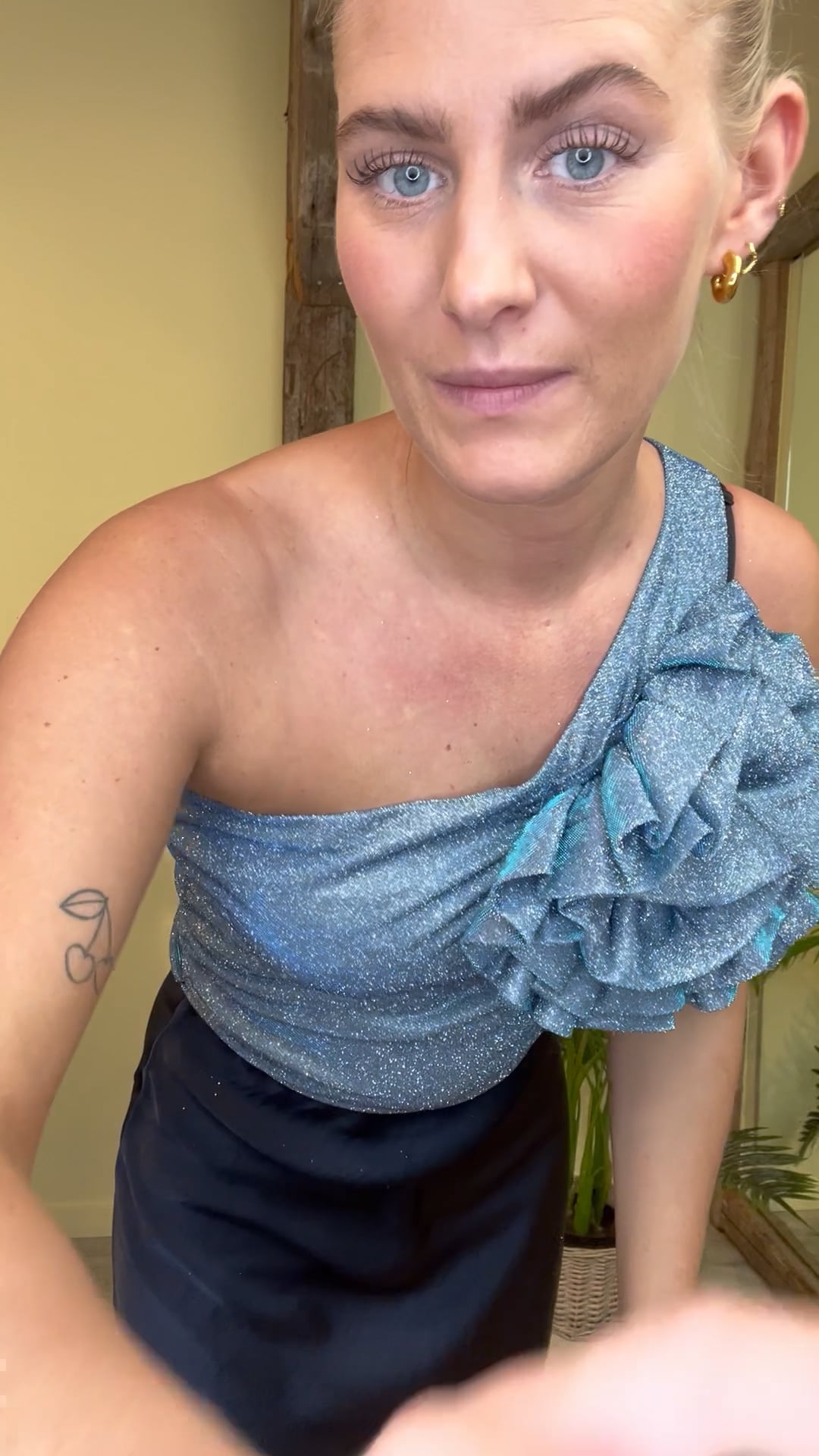 Den smukkeste top fra Crás er kommet i en smuk blå farve med glimmer effekt. Den er oneshoulder i modellen og har en fin stor rose detalje foran ved venstre bryst. Den er ogsp draperinger i siden så den sidder tæt til kroppen uden at stramme. Vi anbefaler at man ryster den inden bryst da der kan kan side lidt rest glimmer efter produktion.