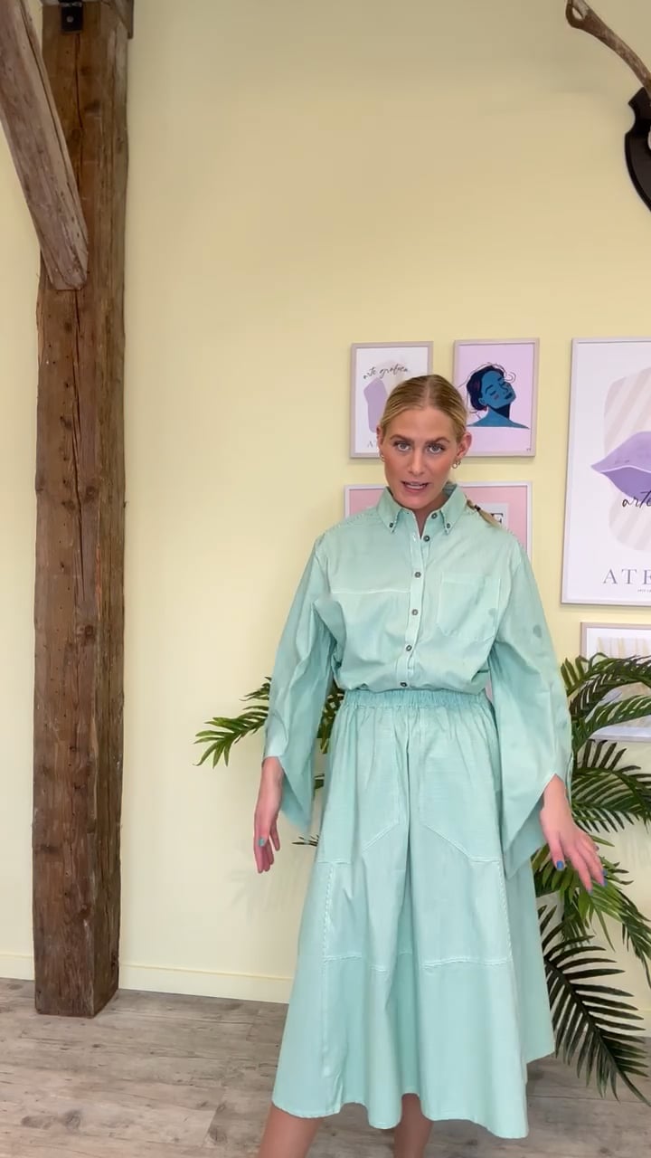 En fin forårsstyle fra Dawn x Dare. Denne nederdel er med striber i hvid og grøn samt har elastik i taljen. Lommerne er skrå samt dybe og stoffet er syet sammen i forskellige retninger så det danner et mønster. Nederdel findes også i orange.