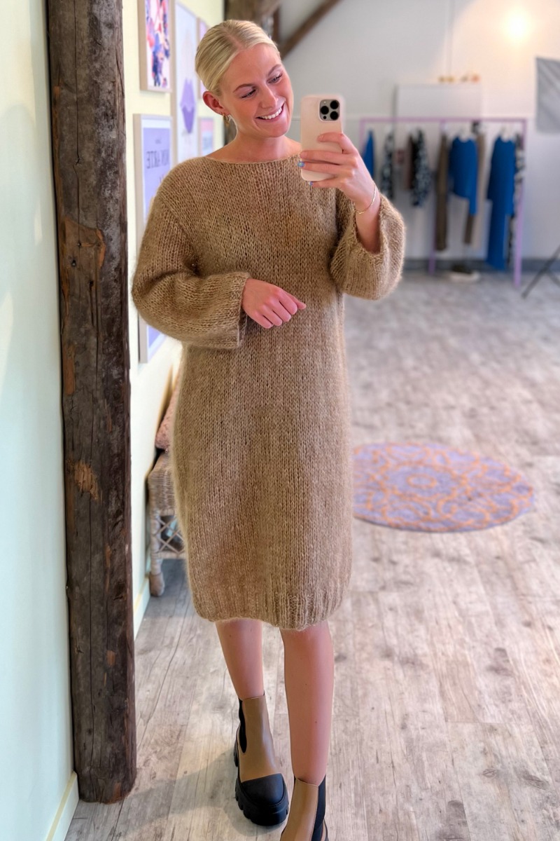 Vi er ved at falde bagover hvor blød og lækker denne strik er fra Dawn x Dare. Strikken er designet som kjole med rund udskæring og lange ærmer. En strikkjole der er nem at style med rå støvler til efteråret.