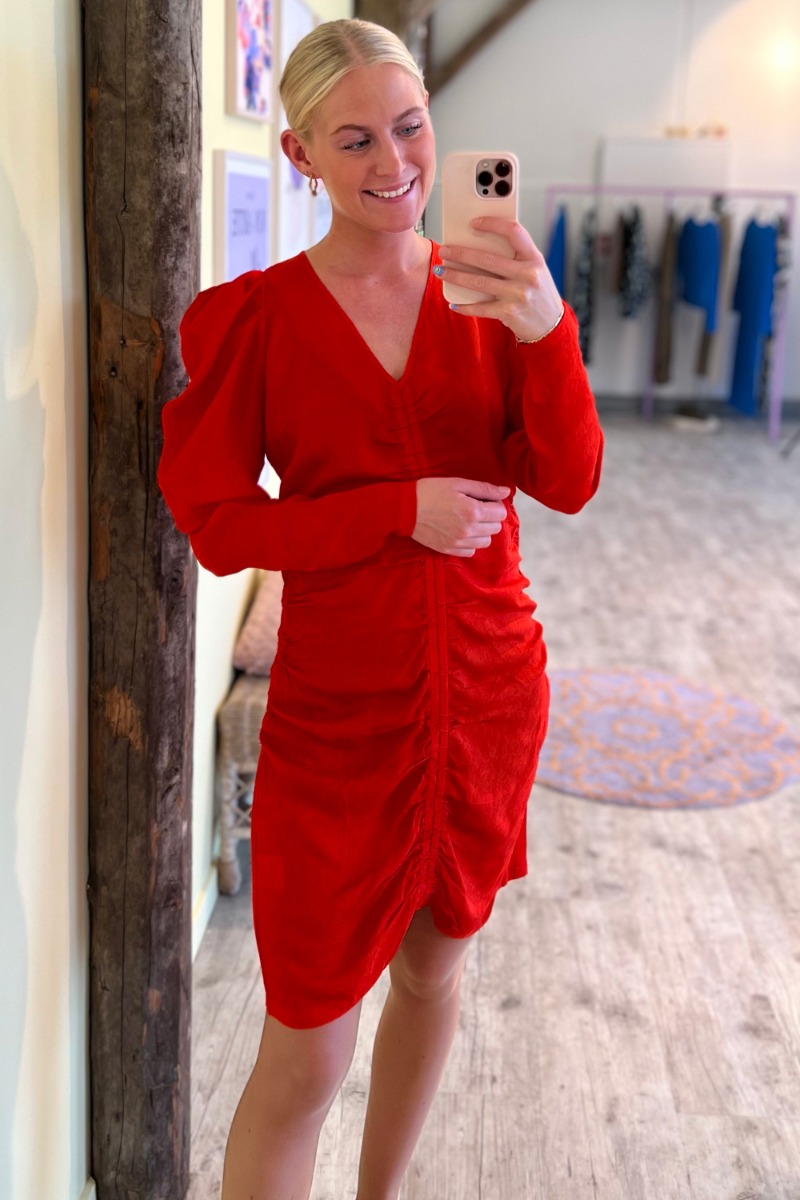 Kjolen er lavet i den smukkeste røde nuance med struktur i stoffet der giver et eksklusivt look. Den er designet med rynkeeffekt i midten der skaber en smuk pasform og falder flot i det lette materiale. De lange ærmer har en smuk puffeffekt og v-udskæring foran. Style kjolen med en stilet til fest.