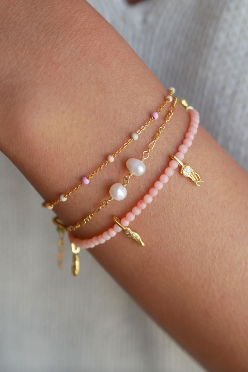 Fineste perlearmbånd fra Enamel. Perlerne er i en smuk koralfarve med små guld vedhæng af havinspireret emaljer. Et simpelt armbånd med smukke sommerlige detaljer. Styl det med resten af den smukke "Ocean Secrets" kollektion fra Enamel.