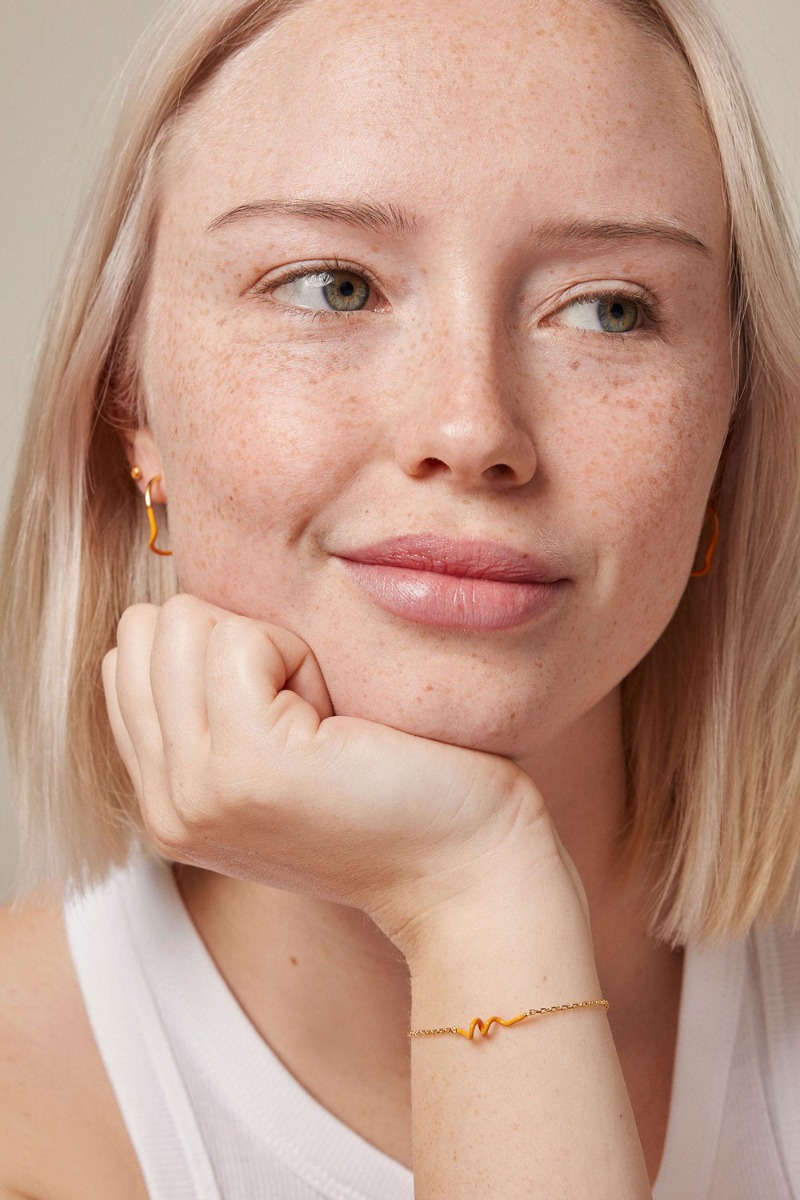 Fint enkelt armbånd fra Enamel med en tynd guld kæde og fin lille orange twist i midten. Armbåndet kan bruges alene og sammen med flere alt efter eget ønske.