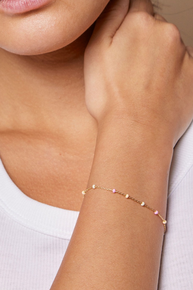 Dette armbånd har et enkelt og elegant design med en fin guldfarvet kæde og små dekorative perler. De lyse perler med enkelte rosa detaljer giver et feminint og let udtryk, som passer perfekt til både hverdag og fest. Armbåndet sidder diskret om håndleddet og tilføjer et stilfuldt touch uden at virke tungt. Det minimalistiske look gør det nemt at kombinere med andre smykker for et personligt udtryk. En smuk og tidløs accessory, der giver et fint strejf af farve og elegance.