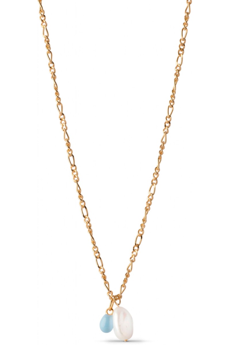 Super sød halskæde fra Enamel med vedhæng. Kæden har to vedhæng, en hvid ferskvabndsperle samt en mindre blå emaljeperle.