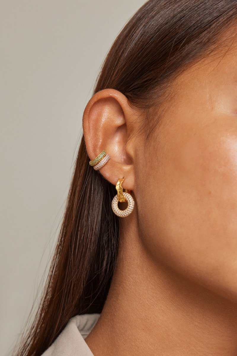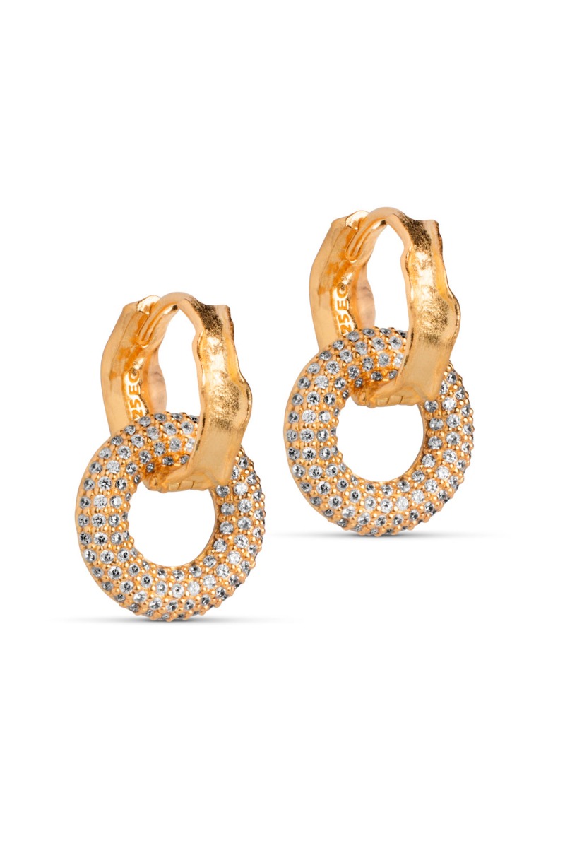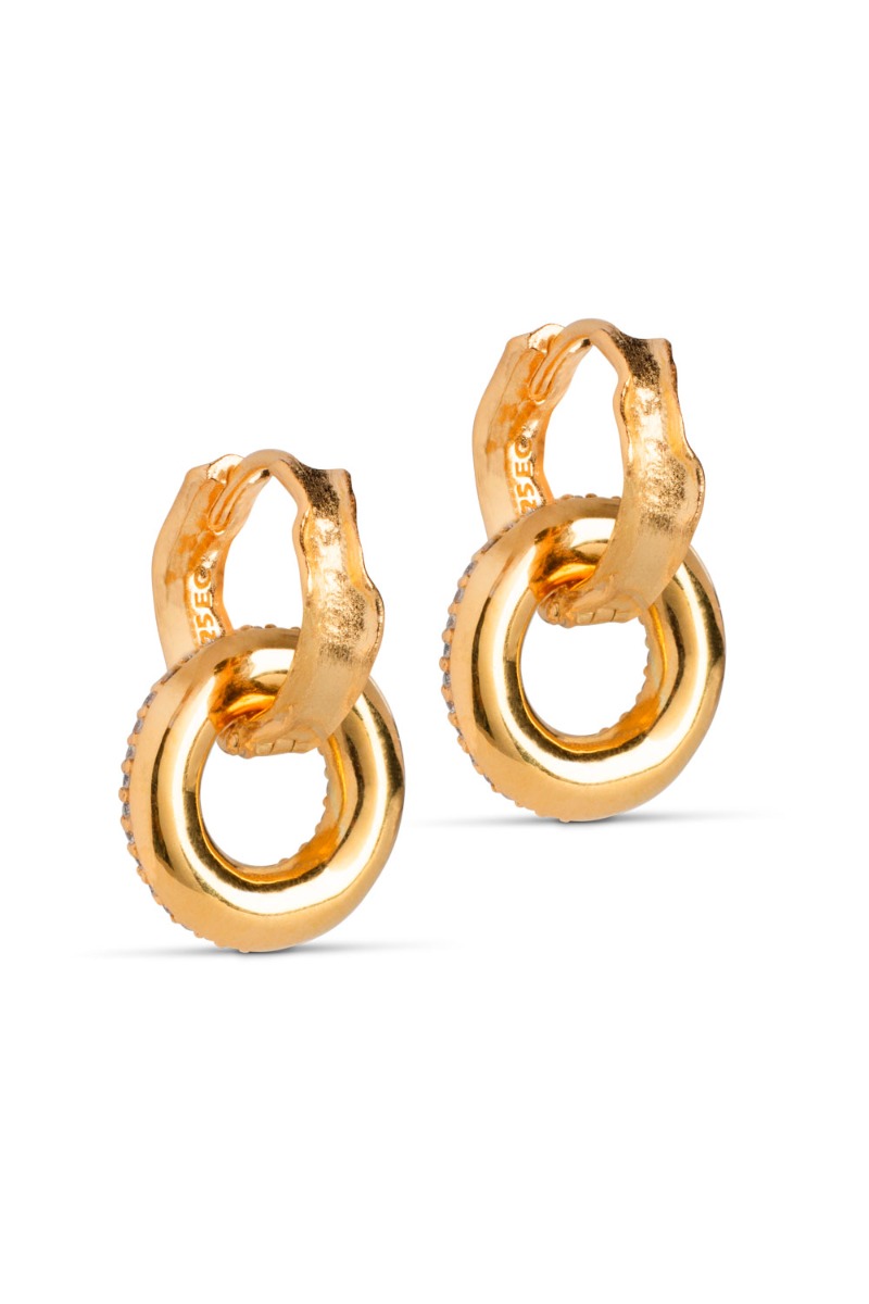 Et par cool og unikke øreringe i guld med hvide sten fra Enamel. De har et rundt udtryk som er utrolig elegant på øret. Celin kan bruges på hele 3 forskellige måder. De fine hoops kan enten bruges alene, som et par afdæmpede hverdagsøreringe, eller du kan påsætte vedhængene på to forskellige måder. Enten kan du vende vedhængene, så de tindrende zirkoner vender udad, hvilket vil give dig et festligt, iøjefaldende look, ellers kan du vende den polerede guldside udad, hvilket vil give dig et cool, afdæmpet, og eksklusivt look.