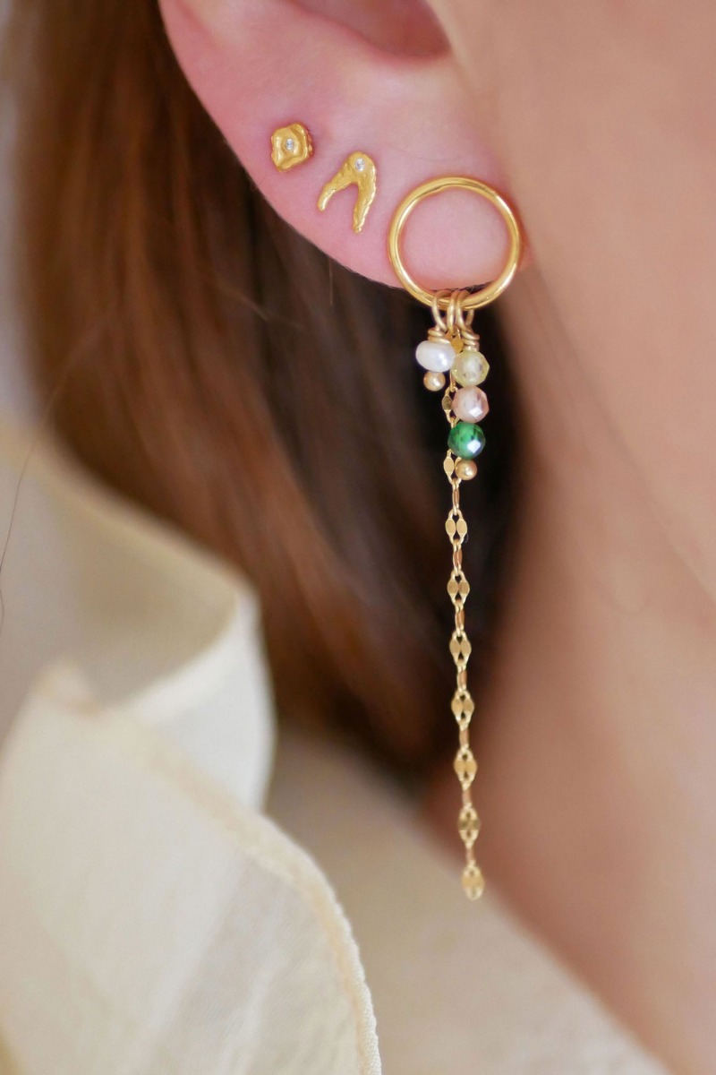 Smukke elegante øreringe fra Enamel. Øreringene er så fine i forgyldt sterling sølv med små sarte rosa sten og grønne. De har et let sofistikeret look der er anvendeligt til din festkjole.
