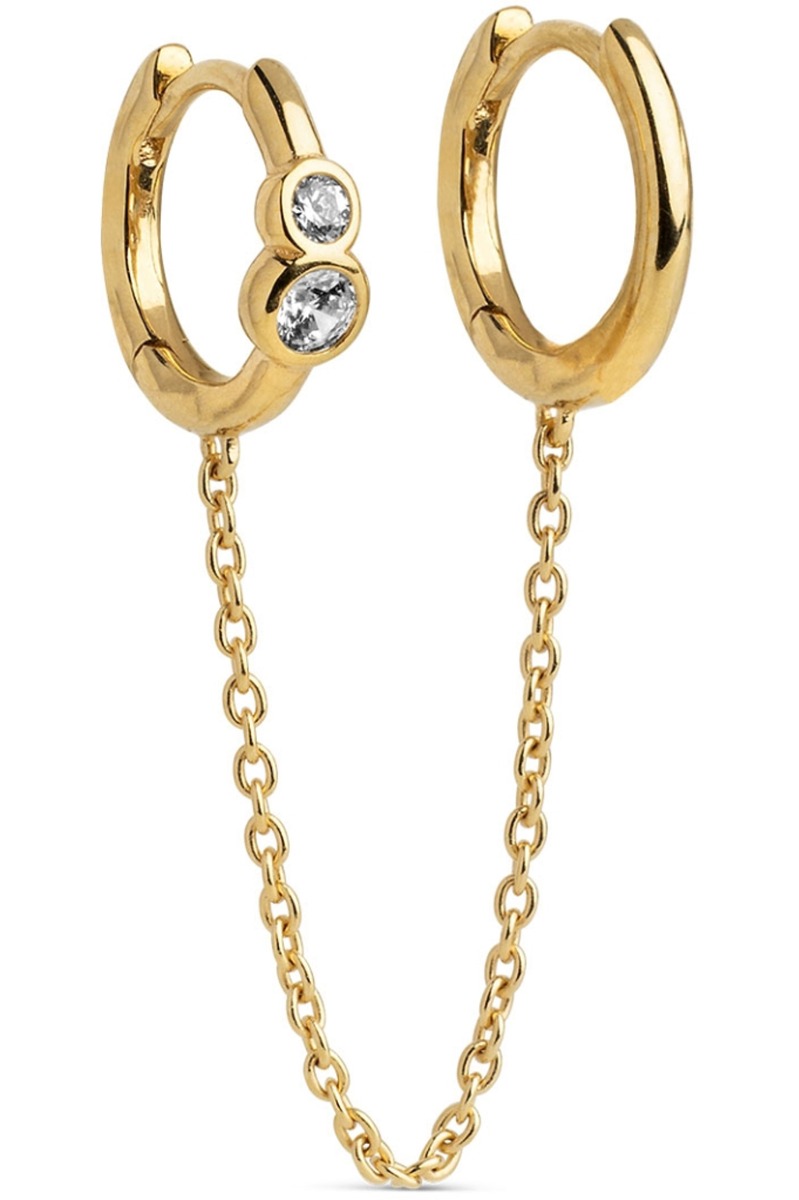 En et stryks øreringe med disse to hoops som hænger sammen med en smal kæde. De giver en fin effekt ved øret og på den ene hoop er der også sat to sten.