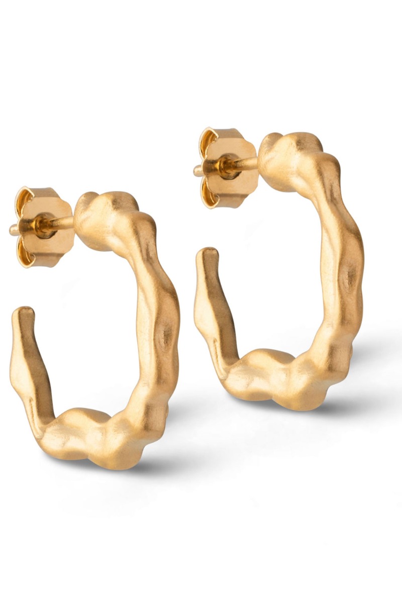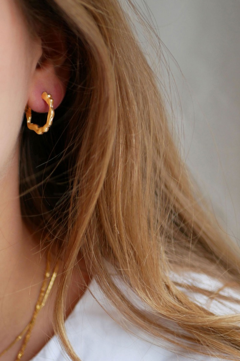Runde hoops i et smukt wave look. Øreringen er super feminin og findes også i sølv. Et perfekt bud på en ørering der kan bruges både til hverdag og fest.
