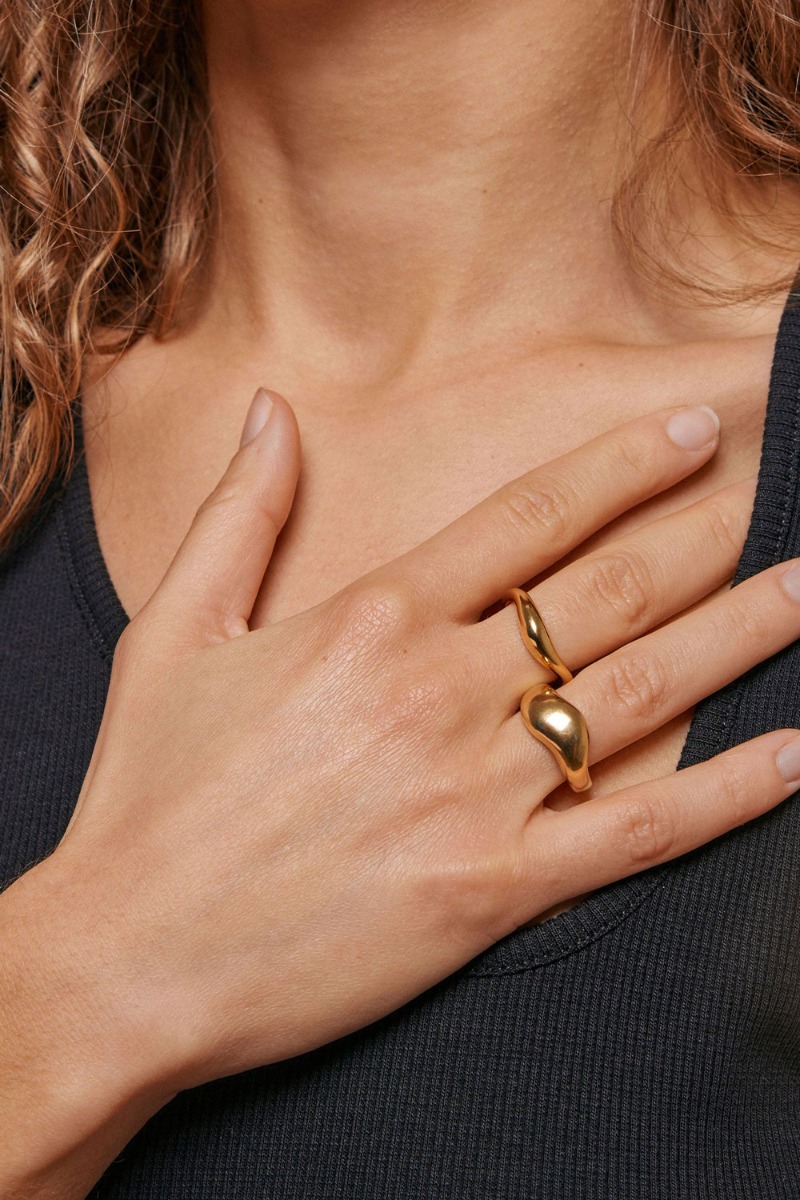 En smuk ring fra Enamel er landet i en guld farve. Det er en model vi kender, men den er lavet i en forstørret udgave. Den har en rund afslutning på siderne og et fint bølget knæk som går henover fingeren. Ringen findes også i sølv og som sagt i en smallere version.