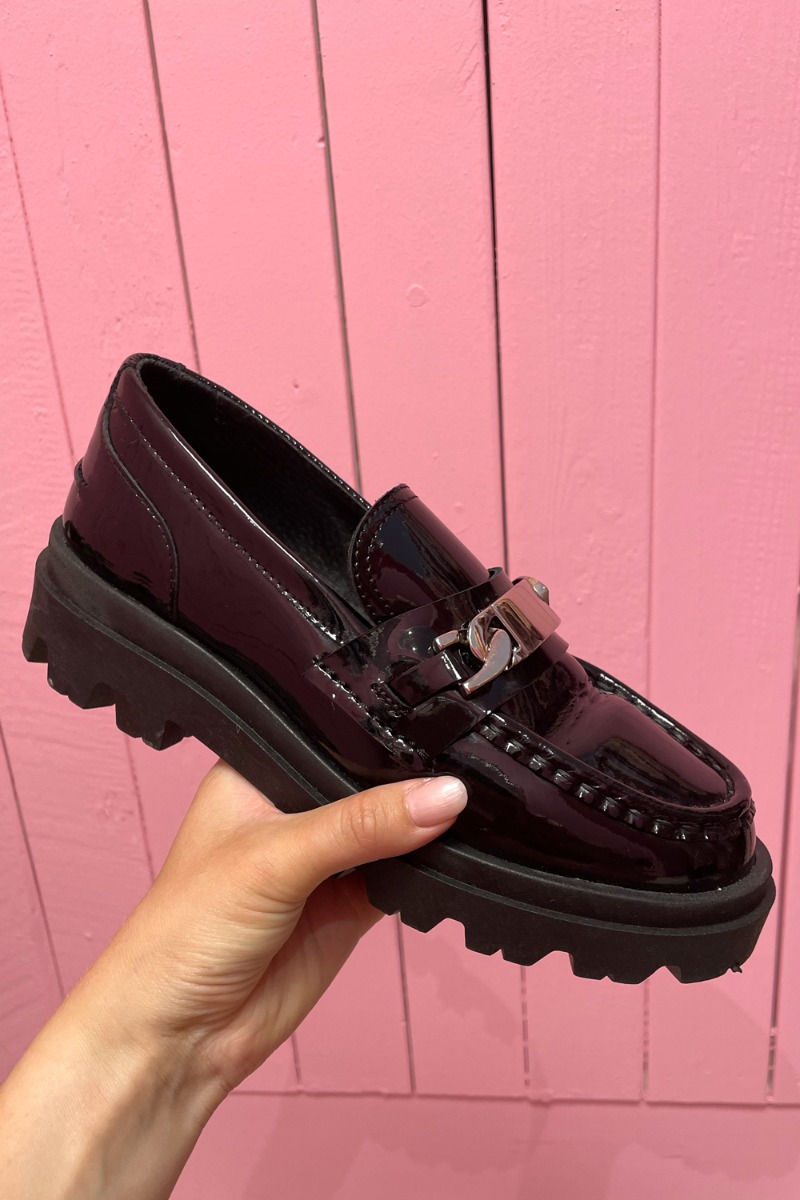 Super cool sko fra Pavement i loafers stil i sort lakret læder. Skoene har en chunky sål. Foran er placeret et metalspænde der giver en virkelig fed detalje. Kan styles til både jeans og bukser eller med en farvet strømpe i til en kjole.