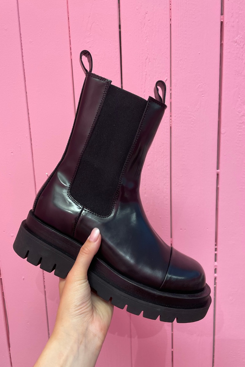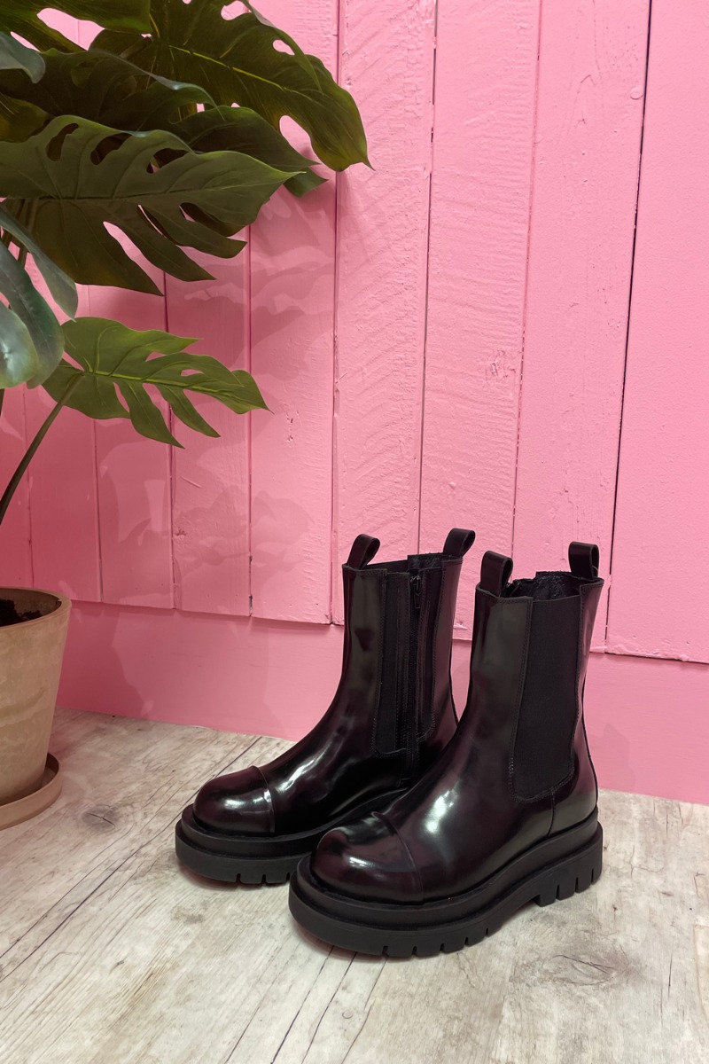 Det her er altså en virkelig cool støvle fra Pavement! Støvlen er i blank stort læder med lynlås i siden så den er nem at komme i. Støvlens snude er rund og med den elegant detalje hvor læderet bliver markeret med en kant. Der er en god kraftig gummisål under der spiller rigtig flot sammen med den blanke overflade. I toppen af skaftet er der strop både for og bag, skaftet er medium højt.