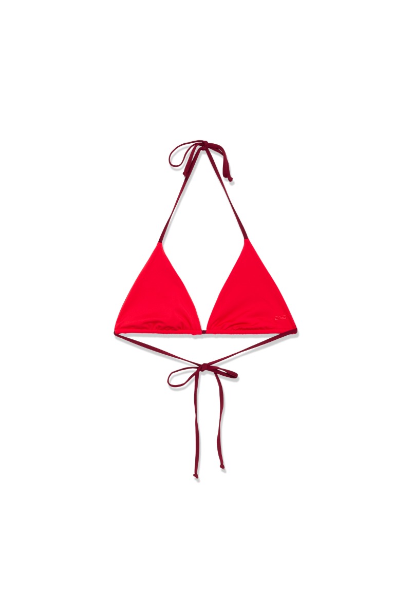 Bikinitoppen er designet i en smuk, dyb bordeaux farve med et klassisk trekantsnit. Den har bindebånd i nakken og på ryggen, som gør pasformen justerbar og giver god komfort. Det enkle design skaber et tidløst og feminint udtryk. Materialet er blødt og elastisk, så toppen sidder behageligt mod huden. Bikinitoppen kan nemt matches med de tilhørende bikinitrusser for et elegant strandlook.