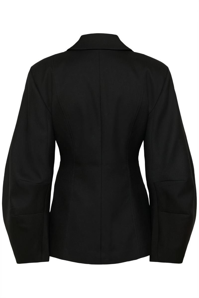 Blazeren er designet i en klassisk sort farve med et elegant og figursyet snit. Den har en dyb V-udskæring med revers, som giver et sofistikeret udtryk. Den markante lynlåslukning foran fremhæver taljen og skaber en moderne silhuet. Diskrete syninger understreger pasformen og giver et struktureret look. Blazeren er ideel til både formelle anledninger og et stilfuldt hverdagsoutfit.
