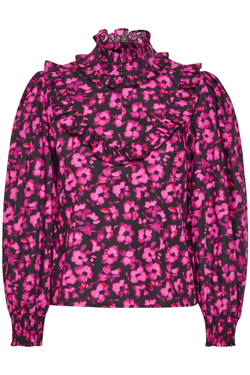 Smukkeste skjorte fra Gestuz med sort bundfarve og printet med det fineste pink blomsterprint. Skjorten har et løst udtryk med lange løse ærmer og smock ved ærmet. Foran på brystet har skjorten de fineste flæsedetaljer som giver et flot og elegant udtryk på skjorten. Ved halskraven har den en lille skjult lynlås som kan styles efter eget ønske.