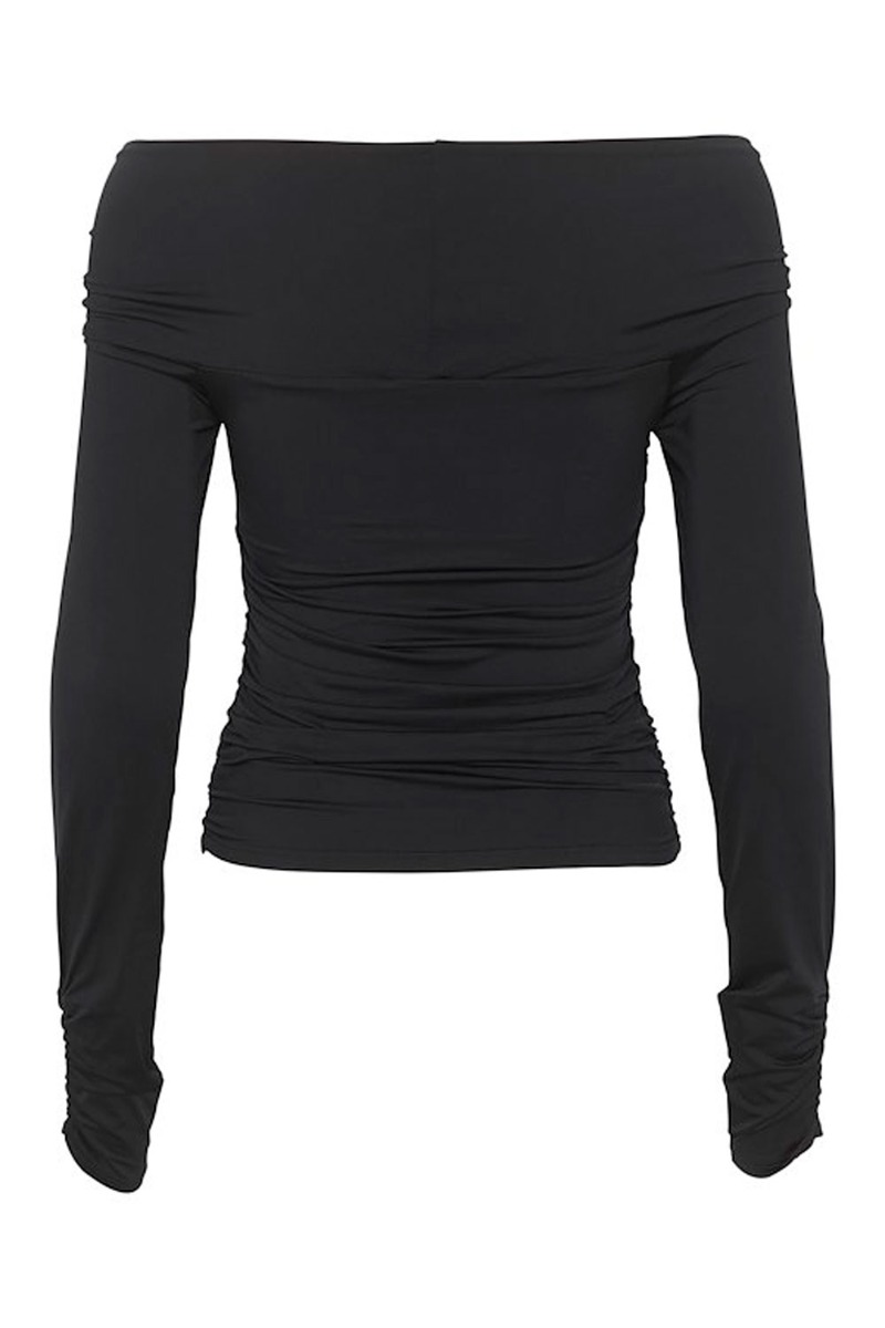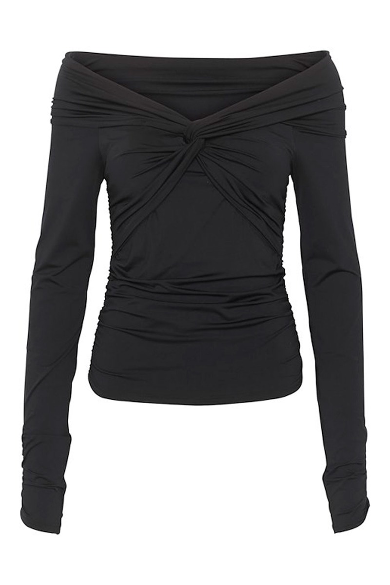 En smuk enkel bluse fra Gestuz i sort med fine detaljer foran. Blusen har en knudedetalje fortil og går halvt ned på skulderen hvilket giver et utrolig feminint look. Den er tætsiddende med stretch og smuk at style både med bukser og nederdel.
