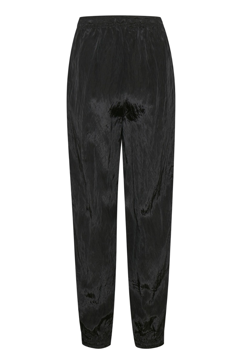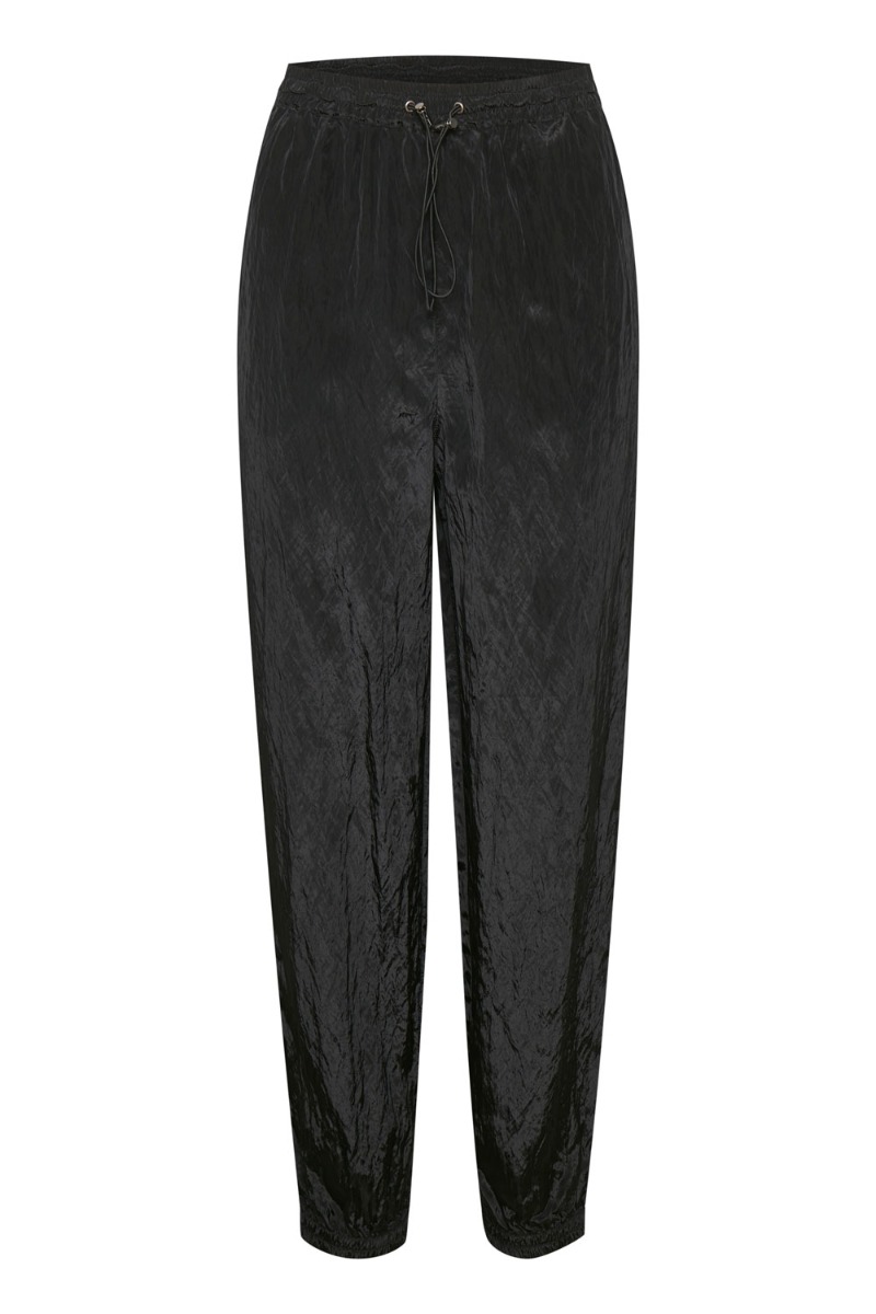 Sporty og super trendy buks i let shiny materiale fra Gestuz. Bukserne har en lettere løs pasform der afsluttes med elastik i bunden. Taljen kan snøres ind efter ønske og kan styles helt afslappet med en tee eller til fest med en stilet og en feminin skjorte.