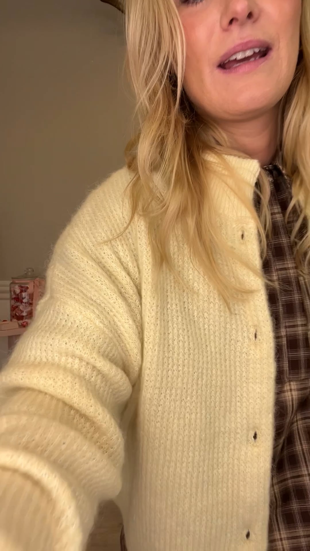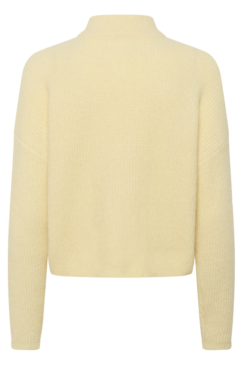 Cardiganen er designet i en blød, lys gul nuance med et enkelt og feminint udtryk. Den har en rund hals og knaplukning foran med mørke knapper, som skaber en fin kontrast. Pasformen er let afslappet med lange ærmer, der giver god komfort. Det strikkede materiale føles blødt og behageligt mod huden. Cardiganen er nem at style og passer perfekt til både kjoler, bukser og nederdele.
